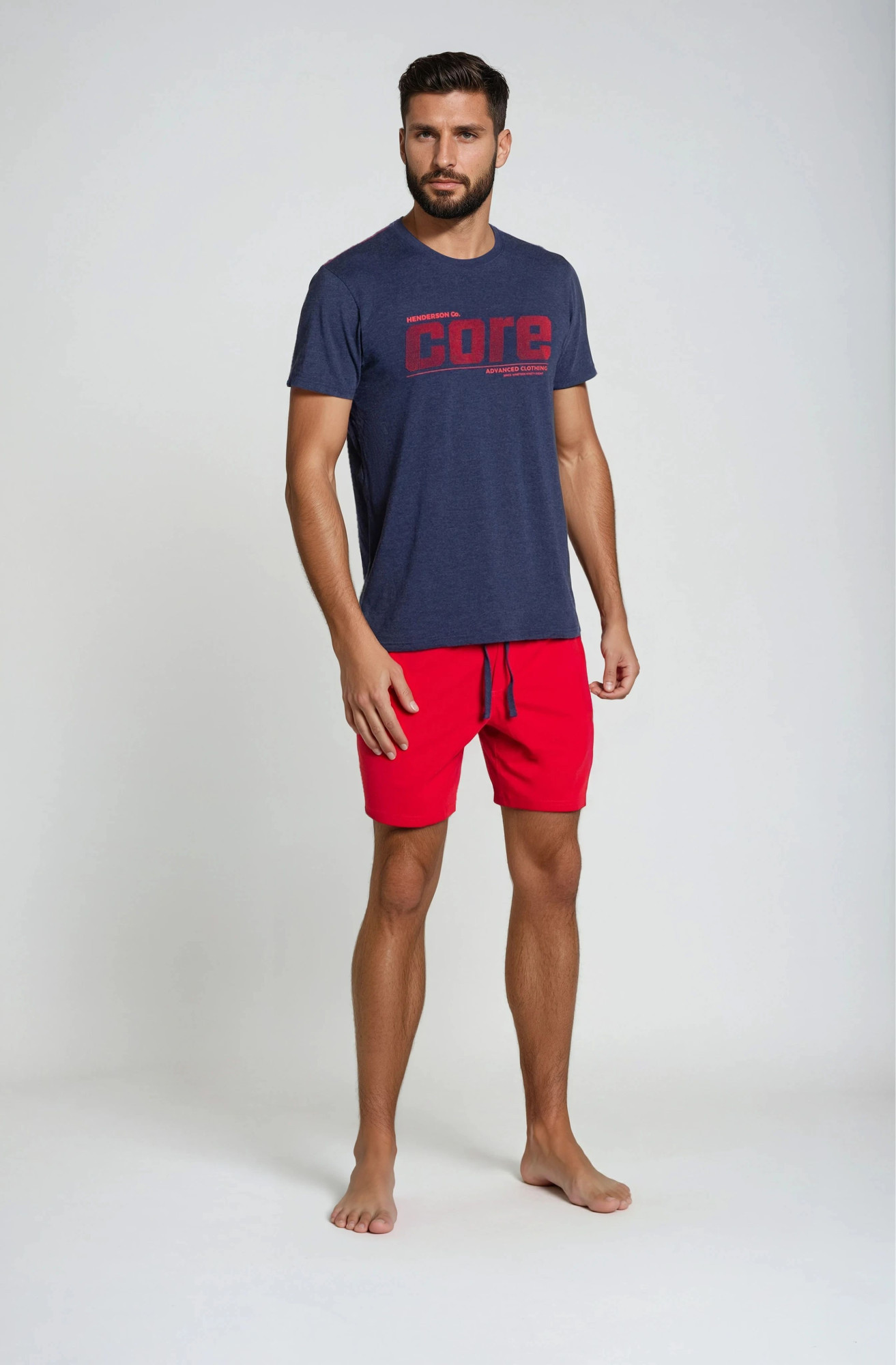 Námořnicky modré a červené pánské pyžamo z nové kolekce značky Henderson. Halenka Henderson Core s pogumovaným potiskem a 3D efektem (potisk, který je cítit na dotek) - stylová a rozhodně s charakterem, může vám posloužit i jako domácí oblečení. Kalhoty s elastickým pasem doplněné vázáním. Složení: košile 80% bavlna, 20% polyester, kalhoty 100% bavlna.