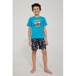 Piżama chłopięca YOUNG KR 790/123 ROAD TRIP to wygodny i stylowy komplet nocny, idealny na cieplejsze dni. Wykonana w 100% z wysokiej jakości bawełny, jest miękka, przewiewna i przyjazna dla delikatnej skóry dziecka. Koszulka z krótkim rękawem została ozdobiona modnym nadrukiem na wysokości klatki piersiowej, który nadaje piżamie młodzieżowego, dynamicznego charakteru. W komplecie znajdują się krótkie, wzorzyste spodenki, zapewniające swobodę ruchów i komfort snu. Piżama zapakowana jest w estetyczne pudełko, dzięki czemu świetnie sprawdzi się również jako prezent.