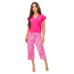 Wybierz wygodę i kobiecy styl na każdą noc! Piżama damska Zebra to komfortowy, bawełniany komplet idealny zarówno na cieplejsze, jak i przejściowe pory roku. Połączenie gładkiej koszulki z efektownymi spodniami w zwierzęcy print tworzy modny i ponadczasowy zestaw homewear. Koszulka z krótkim rękawem oraz dekoltem w kształcie litery „V” delikatnie podkreśla sylwetkę i zapewnia pełną swobodę ruchów. Spodnie o długości 3/4, ozdobione dynamicznym wzorem zebra, nadają całości charakteru i wyróżniają komplet spośród klasycznych piżam. Elastyczna talia gwarantuje wygodne dopasowanie do figury. Wykonana w 100% z naturalnej bawełny piżama jest miękka, przewiewna i przyjazna dla skóry. To doskonały wybór dla kobiet ceniących komfort, jakość oraz modny design. Model dostępny w rozmiarach od S do 2XL. Pakowana w praktyczny foliowy worek – idealna również jako pomysł na prezent.