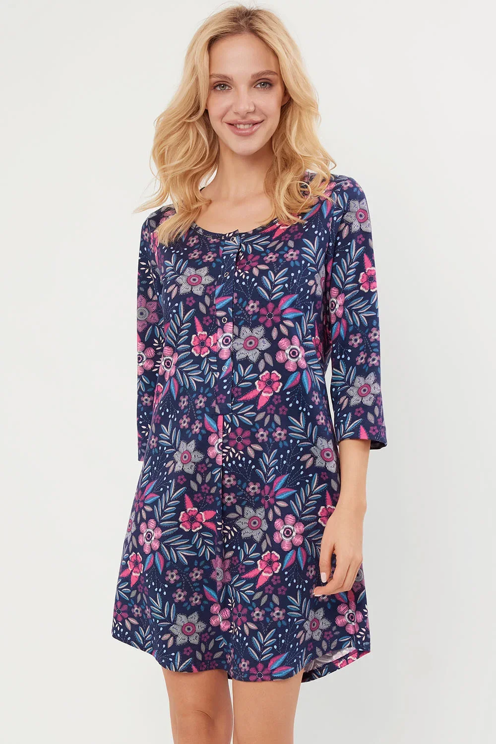 Nocna marki Italian Fashion. Model Folk r.3/4. Produkt został wykonany z 100% bawełna. Długość rękawa: 3/4. Rodzaj dekoltu: okrągły. Nocna zapinany na zatrzaski. Miejsce zapięcia: przód. Produkt damski. Długość: midi.