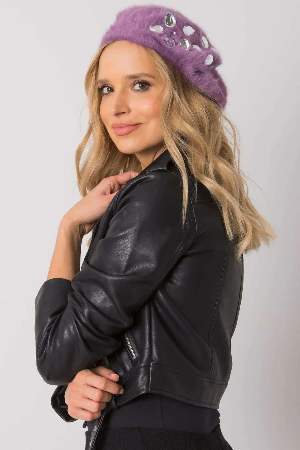 Baret ve fialové barvě zdobený krystaly.