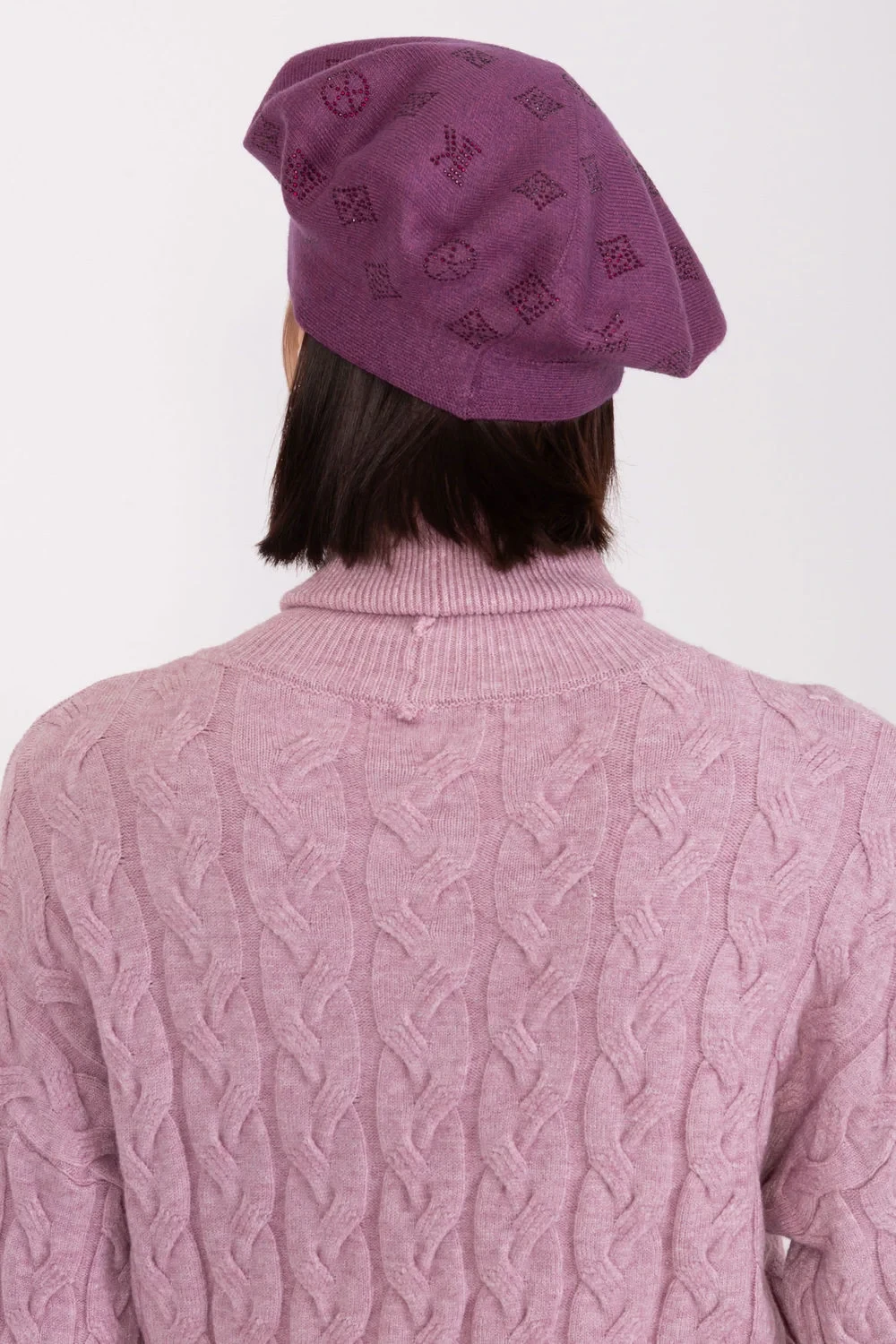 Pletený baret se zajímavou kamínkovou aplikací.
