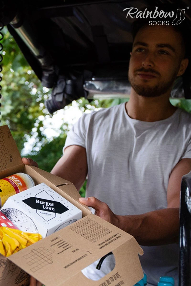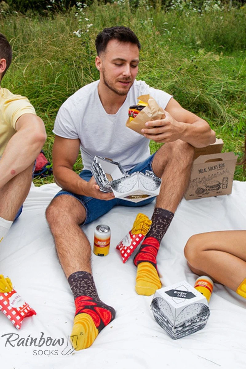 Meal Socks Box je nabídka pro každého, kdo má každý den vlčí chuť na vtipné ponožky nebo rychlé občerstvení. Největší hlad zažene burger, hranolky a plechovka piva v take-away setu, které dohromady tvoří 5 párů originálních ponožek. Set osloví ženy i muže, kteří hledají neobvyklé, bavlněné ponožky.
