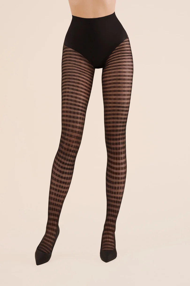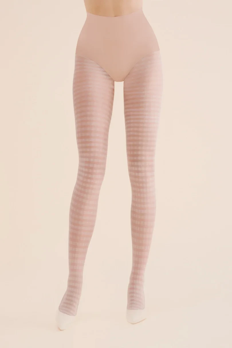 Exkluzivní punčochové kalhoty z elastické příze ovinuté polyamidovým hedvábím. Bez oddělené kalhotkové části, s bavlněným klínem, šité plochým švem.