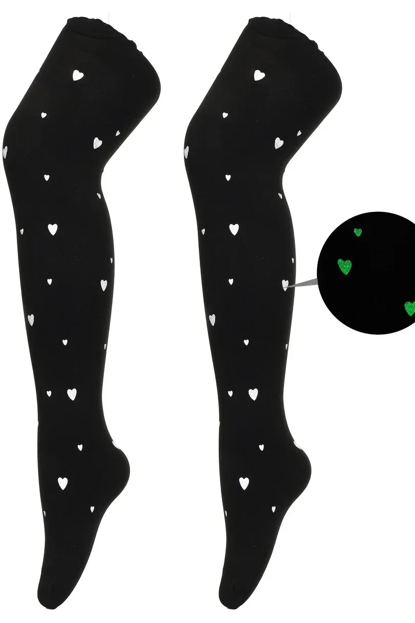 Dziewczęce rajstopy wzorzyste o grubości 40 den, doskonale przylegające do nóg, nadrukowane delikatnym, fluorescencyjnym wzorem.