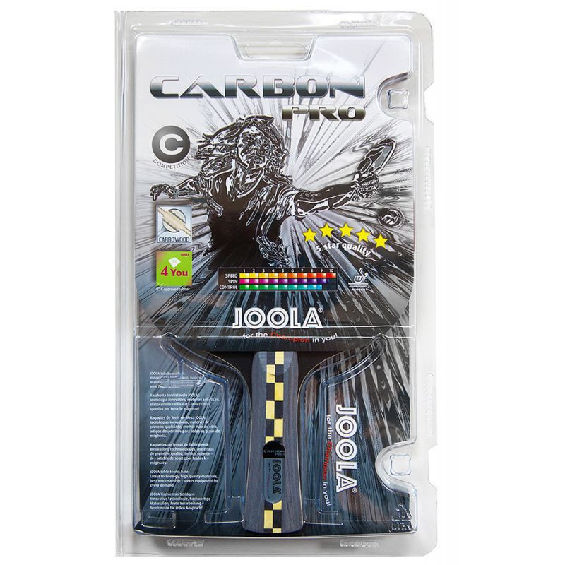 Rakietka Joola Carbon Pro to wysokiej jakości, profesjonalna rakietka do tenisa stołowego marki Joola. Paletka została wykonana z pięciu warstw drewna, pokrytego specjalną gumową okładziną Joola 4 YOU o grubości1,9 mm, zatwierdzoną przez Międzynarodową Federację Tenisa Stołowego (ITTF). Rakietkę wzmocniono przy użyciu technologii Carbowood (włókno węglowe), co skutkuje niższą wagą rakietki i większym obszarem sweet-pot (idealną powierzchnią odbicia), zapewniając idealne przenoszenie drgań i większą precyzję uderzeń. Rozszerzona rączka doskonale dopasowuje się do dłoni i eliminuje ryzyko wyślizgnięcia się paletki z ręki. Rakietka Joola Carbon Pro została zaprojektowana dla graczy, którzy preferują bardziej agresywny styl gry. Siła i szybkość w połączeniu z najwyższą rotacją, charakteryzują tę dynamiczną, ofensywną paletkę.