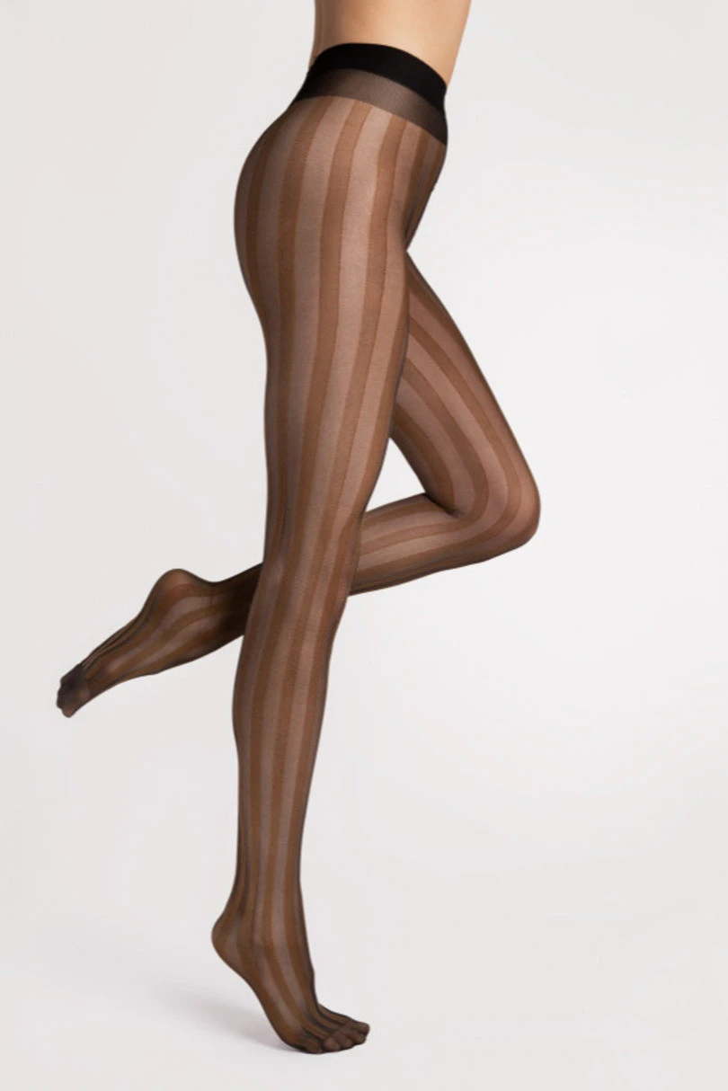 Grafické, svisle pruhované punčocháče, opticky zeštíhlující nohy. Moderní design pro zeštíhlující efekt - spodní část do tvaru písmene T a celoplošné punčochové kalhoty, díky čemuž se skvěle hodí i k minišatům a šortkám - kvalitní, matný úplet, materiály od renomovaných evropských dodavatelů.