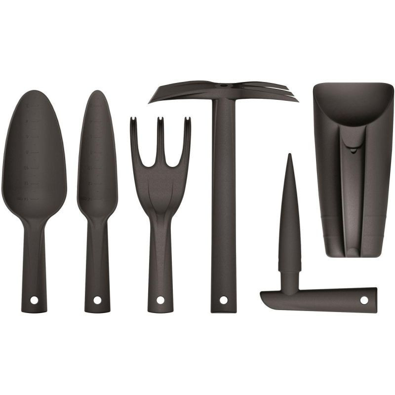 - součástí balení jsou hrábě, ruční rýč, velká lopata, hrábě, krumpáč, nádoba na rozsypávání zeminy