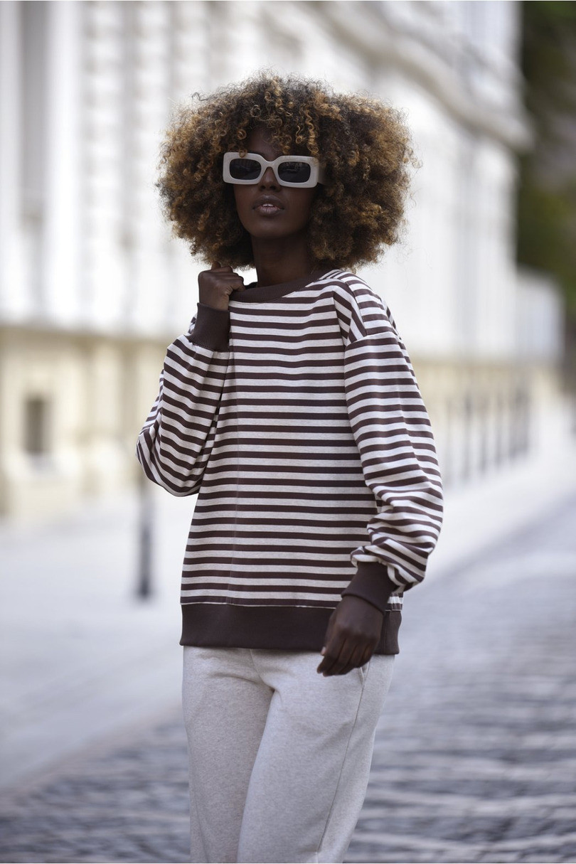 Bluza Riana to doskonały wybór dla kobiet, które cenią sobie modę i wygodę każdego dnia. Dzięki luźnemu krojowi z delikatnym efektem oversize oraz obniżonej linii ramion, zapewnia pełną swobodę ruchu i modny, nonszalancki wygląd. Ściągacze przy rękawach, dekolcie i w pasie dodają jej sportowego charakteru, jednocześnie podkreślając sylwetkę. Wzór w subtelne paski oraz miękki, przyjemny w dotyku materiał sprawiają, że bluza sprawdzi się zarówno w stylizacjach domowych, jak i miejskich. Idealnie komponuje się z jeansami lub spodniami dresowymi, tworząc wygodny i stylowy look.
