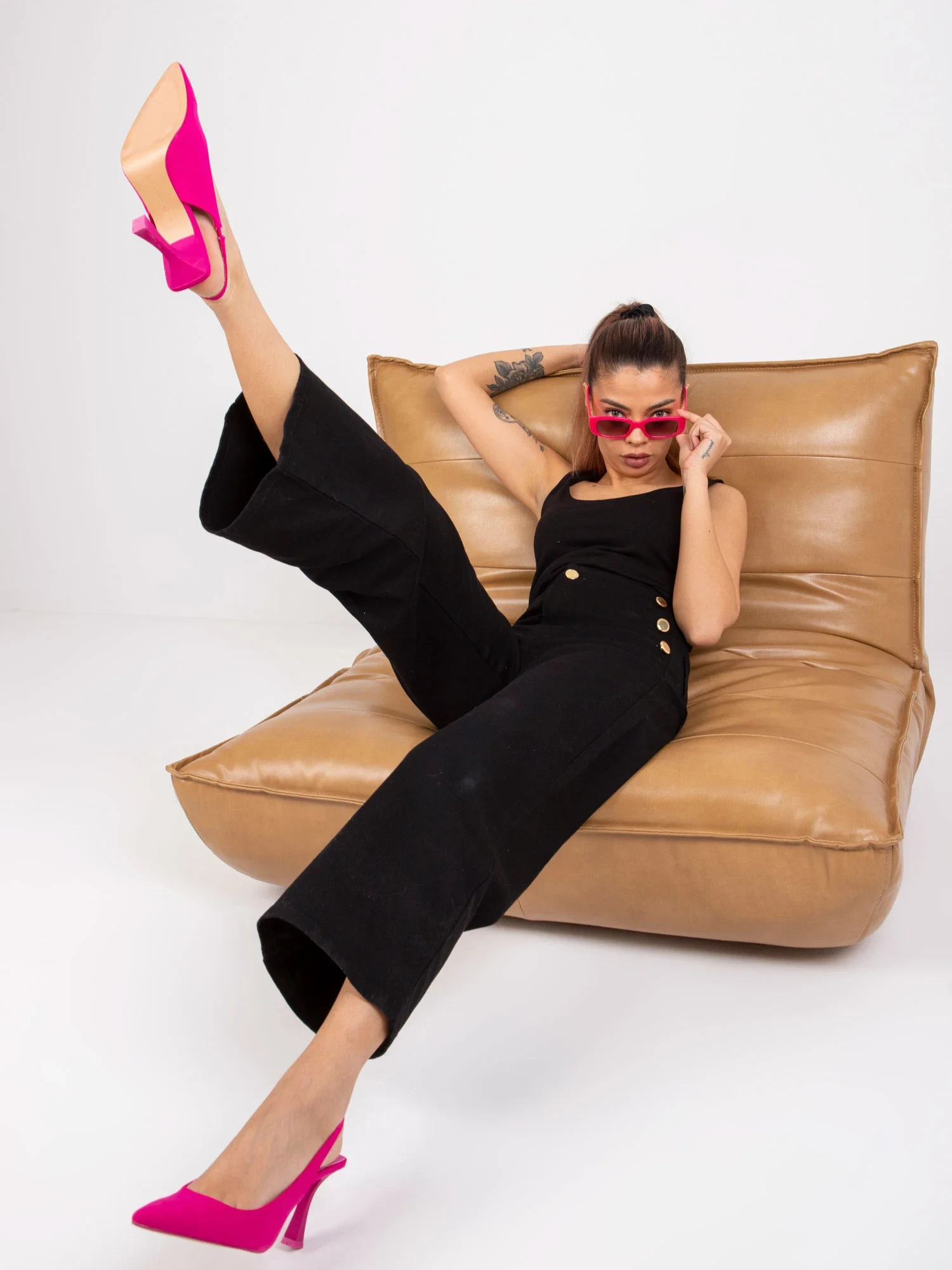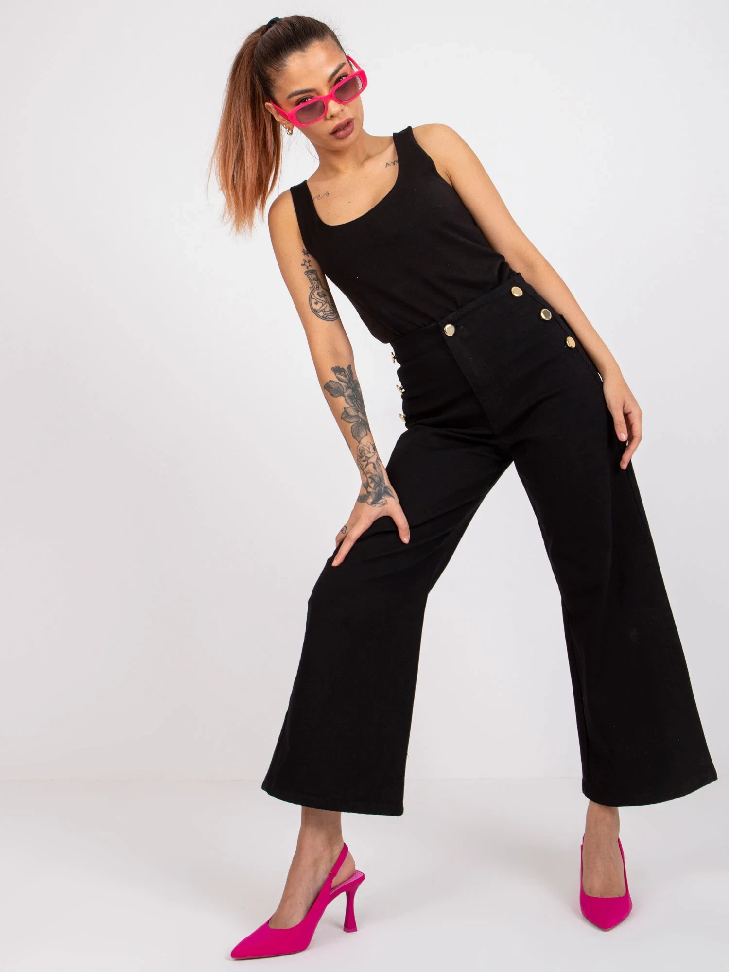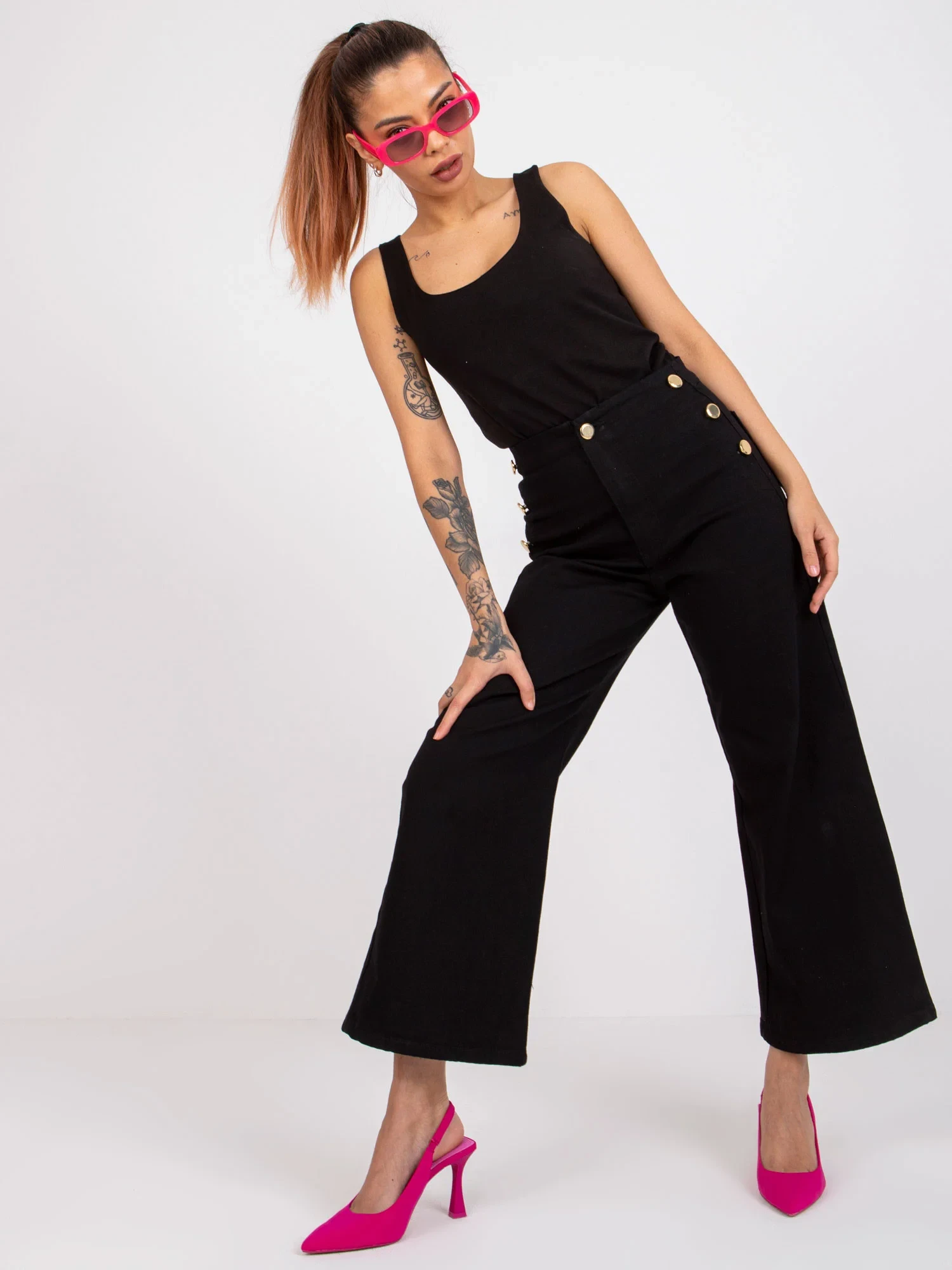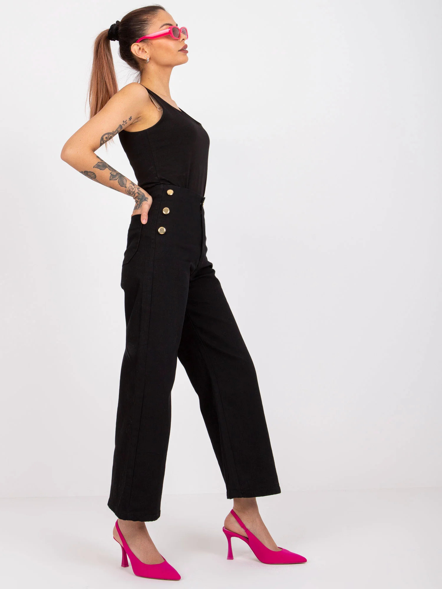 Rozměry kalhot velikosti 36 měřené na plocho: šířka v pase - 32 cm, výška v pase - 30 cm, celková délka - 91 cm.