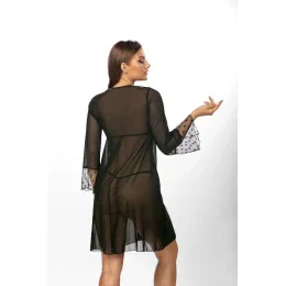Vzdušné negližé se zapínáním vpředu, doplněné svůdnými průsvity. Noste ji na nahém těle nebo na smyslném spodním prádle či noční košilce a dosáhnete efektu, který stojí za hřích. Motiv černé hvězdy dodává negližé charakter a ještě více umocňuje jeho svůdný, neotřelý styl. Sexy tanga jsou součástí balení. Vsuvky nejsou v sadě. Složení: 90 % polyamid, 10 % elastan.