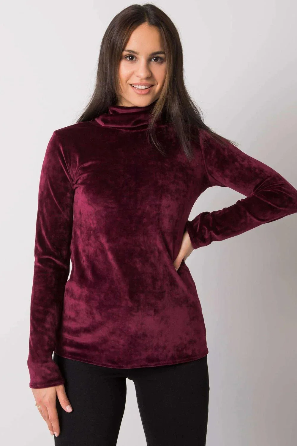 Velurový rolák ve vínové barvě, rovný střih s dlouhými rukávy. Skvěle se hodí pro mnoho příležitostí.