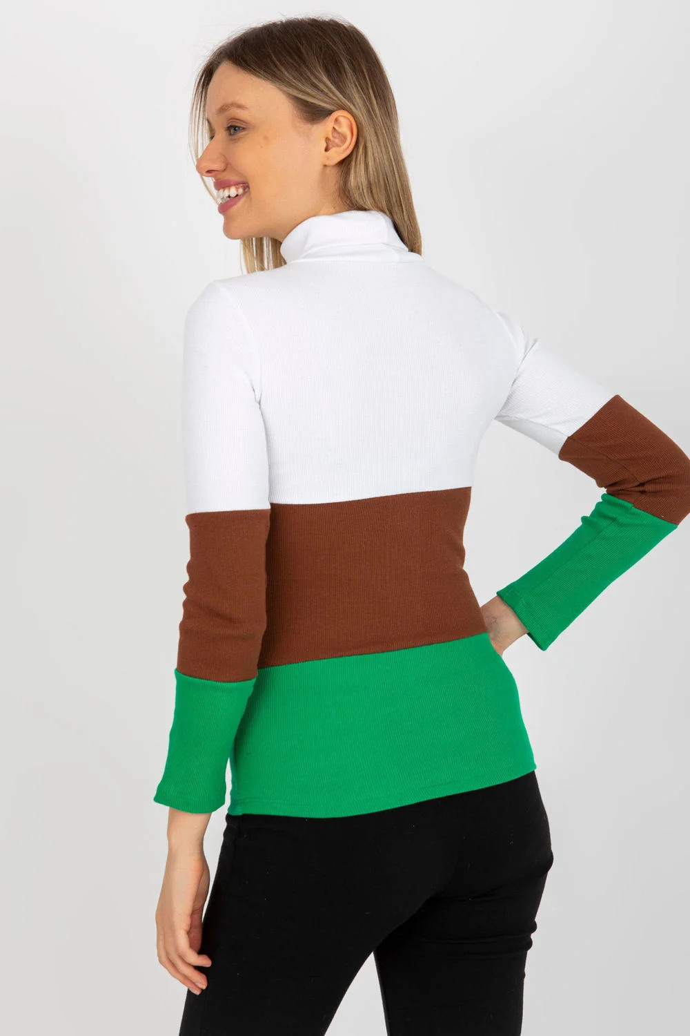 Dámský svetr s dlouhými rukávy a rolákem. Svetr z žebrovaného materiálu ve třech barvách.