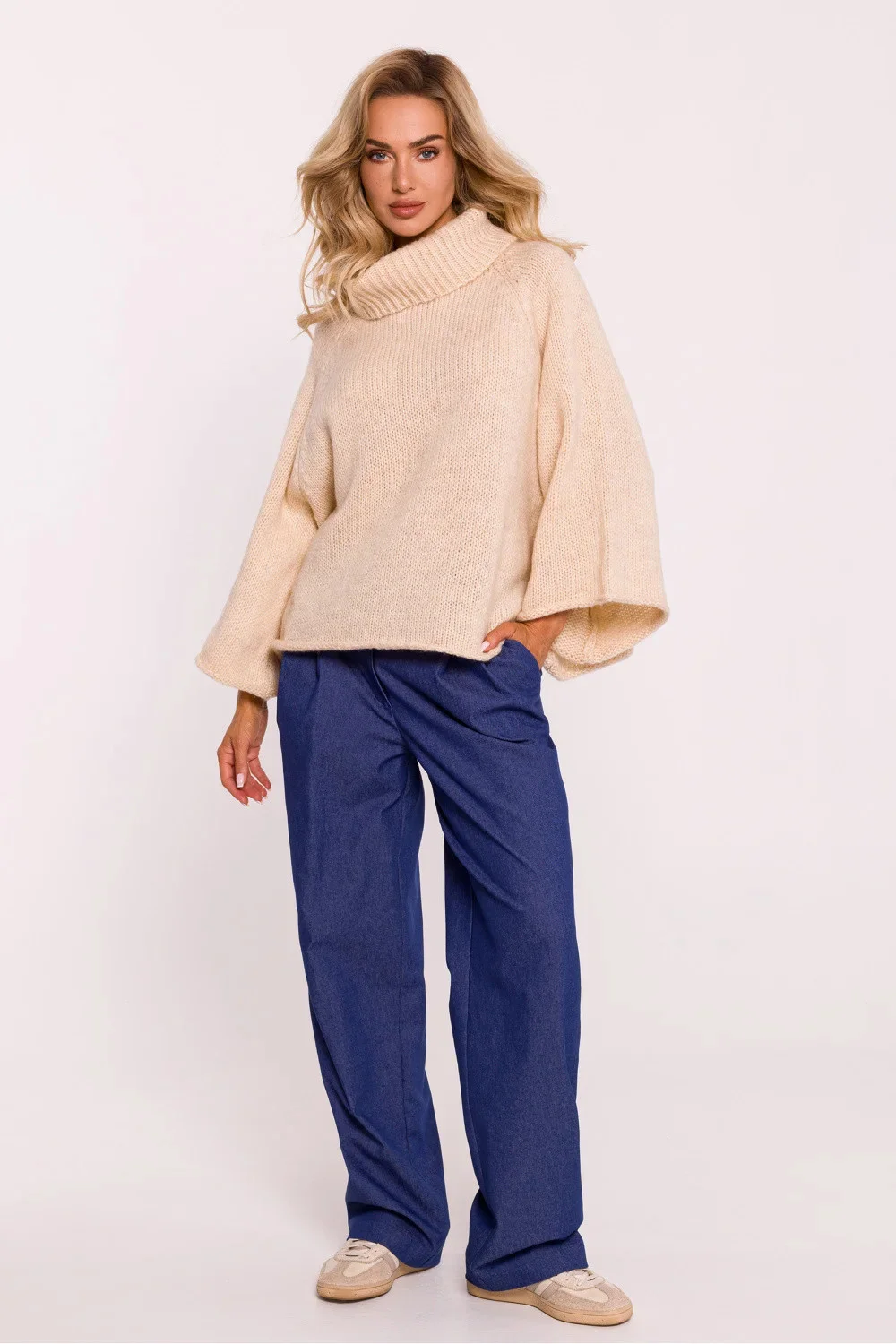 Svetr s rolákem z měkké vlasové příze poskytuje výjimečné pohodlí a teplo. Svetr nadměrné velikosti přes hlavu s volným střihem, který zaručuje volnost pohybu a stylový vzhled. Široké rukávy v délce 7/8 dodávají svetru lehce nonšalantní nádech, ideální pro módní ležérní vzhled. Svetr byl navržen a ušit v Polsku, což svědčí o důrazu na detail a nejvyšší kvalitu zpracování.