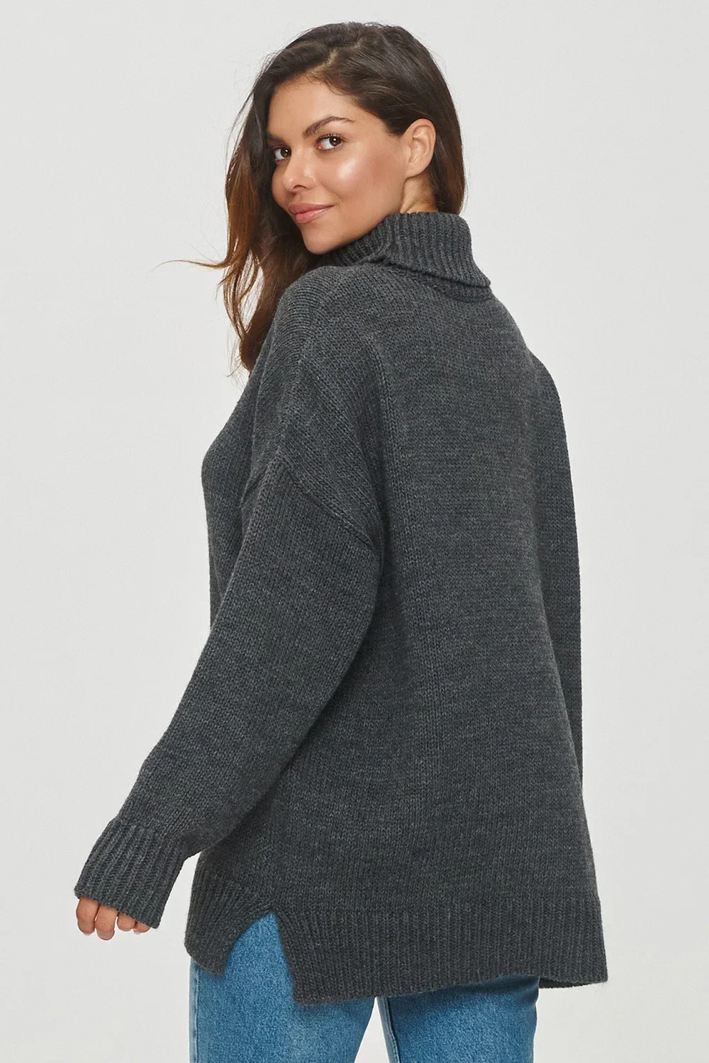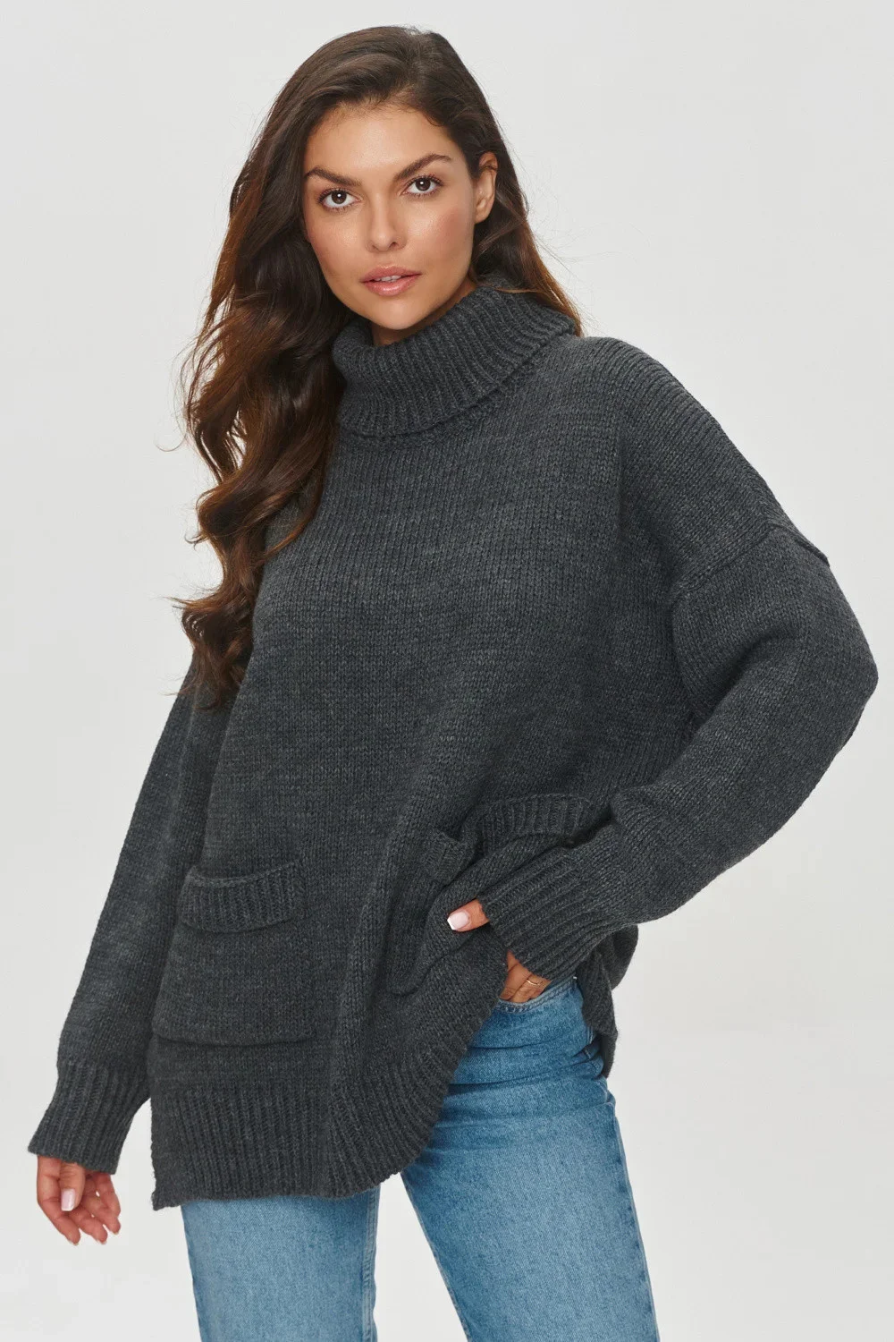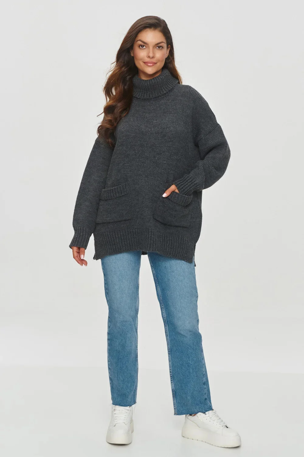 Dámský svetr volného střihu je ideální volbou pro chladnější dny. Model má vysoký stálý rolák, který vás ještě více zahalí a udrží v teple. Materiál je měkký a příjemný. Svetr má volánkové rukávy, které ještě více zdůrazňují jeho ležérní a neformální charakter. Na přední straně jsou dvě našité kapsy, které dodávají funkčnost. Spodní část svetru a manžety jsou zakončeny lemem. Model vyniká svou pohodlností a originalitou. Skvěle vypadá s džínami nebo legínami.