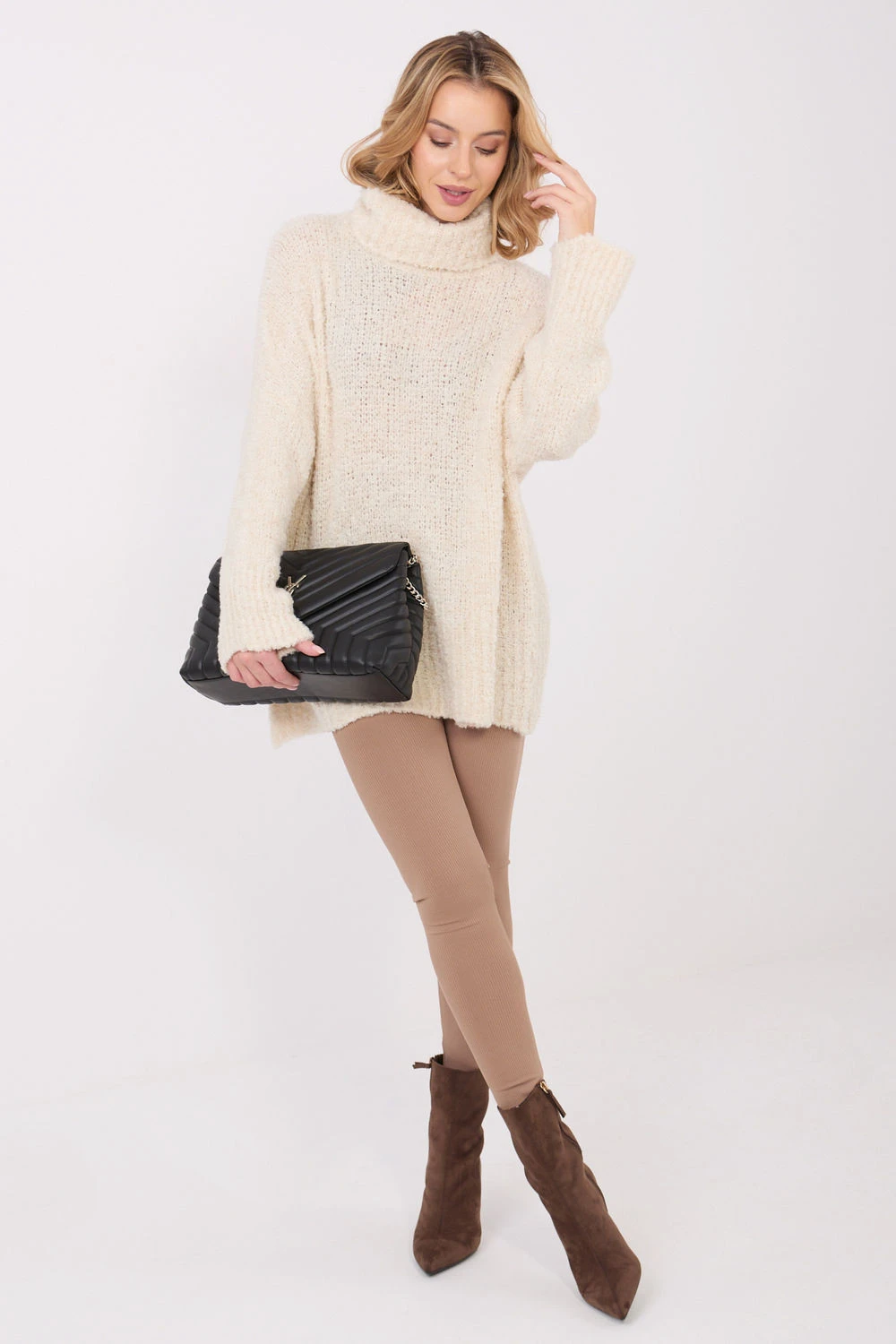 Dámský svetr boucle s golfovým límcem je stylový a pohodlný návrh pro každodenní outfity. Charakteristická smyčková struktura materiálu mu dodává moderní, útulný vzhled, ideální na chladnější dny. Vyrobený z vysoce kvalitní směsi akrylu, vlny, viskózy a polyamidu poskytuje teplo, jemnost a odolnost. Model s dlouhou délkou a dlouhým rukávem dokonale obepíná postavu a zaručuje pohodlí při nošení. Golf efektivně chrání před chladem a absence zapínání zdůrazňuje jednoduchý, ležérní charakter svetru. Hladký vzor z něj dělá univerzální kousek šatníku, který skvěle ladí jak s džíny, tak s legíny nebo sukní.