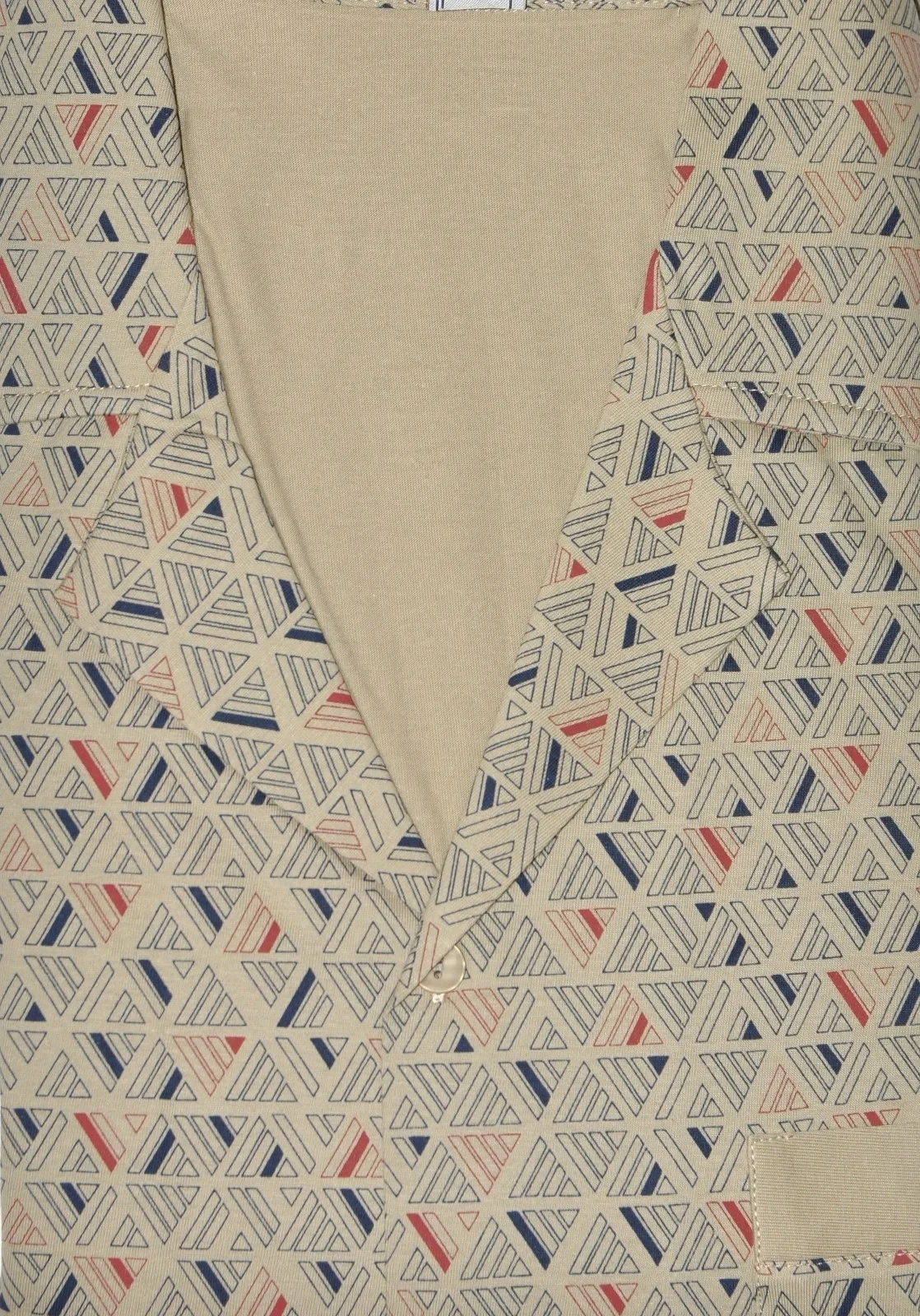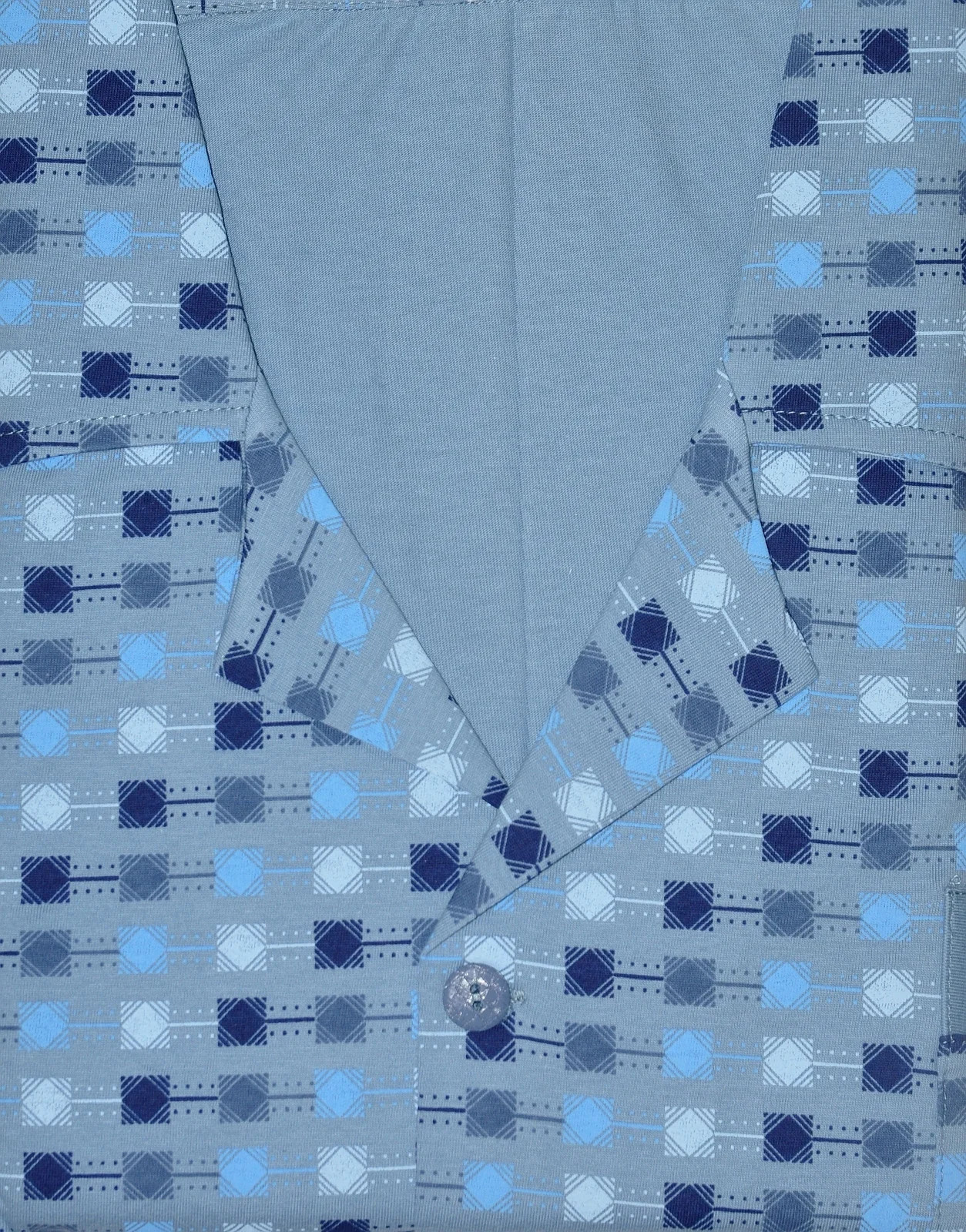 Pyžamo je dlouhé. Vzorovaná blůza se rozepíná, je ozdobená límečkem a doplněná kapsičkami. Dlouhé kalhoty jsou jednobarevné.