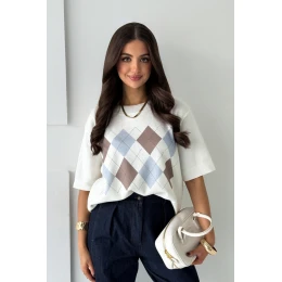 Tento stylový pulovr s krátkým rukávem kombinuje klasický a moderní design s nadčasovou siluetou pro celodenní pohodlí. Výrazný kosočtvercový vzor mu dodává elegantní a zároveň módní charakter, takže je ideální volbou jak pro každodenní nošení s džínami, tak pro formálnější outfity se sakem nebo sukní. Pulovr je vyroben z vysoce kvalitní směsi 50 % bavlny a 50 % akrylu, je měkký, prodyšný a příjemný na dotek.