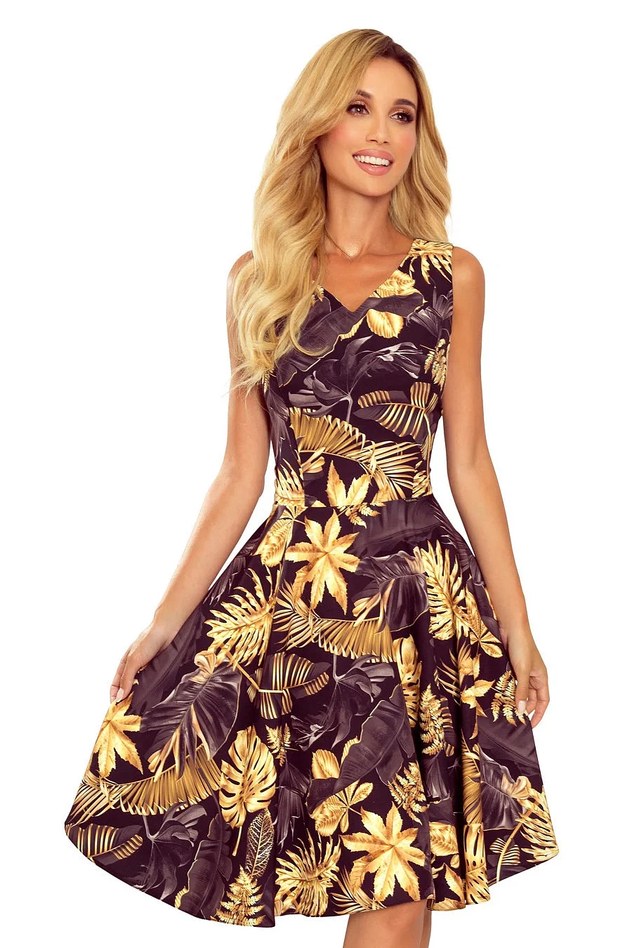Tyto šaty značky Numoco jsou polským výrobkem a jsou ušité z velmi kvalitního materiálu příjemného na dotyk. Model je k dostání v černé barvě se vzorem zlatých listů.