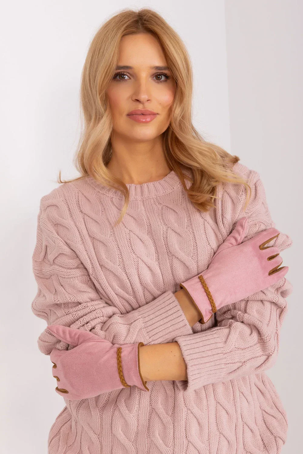 Elegantní dámské rukavice z hladké tkaniny s kontrastními vsadkami mezi prsty. Ozdobné kontrastní pletené pásky na zápěstí. Palec a ukazováček s vyšívanou květinou, která umožňuje ovládat telefon bez nutnosti sundávat rukavice.