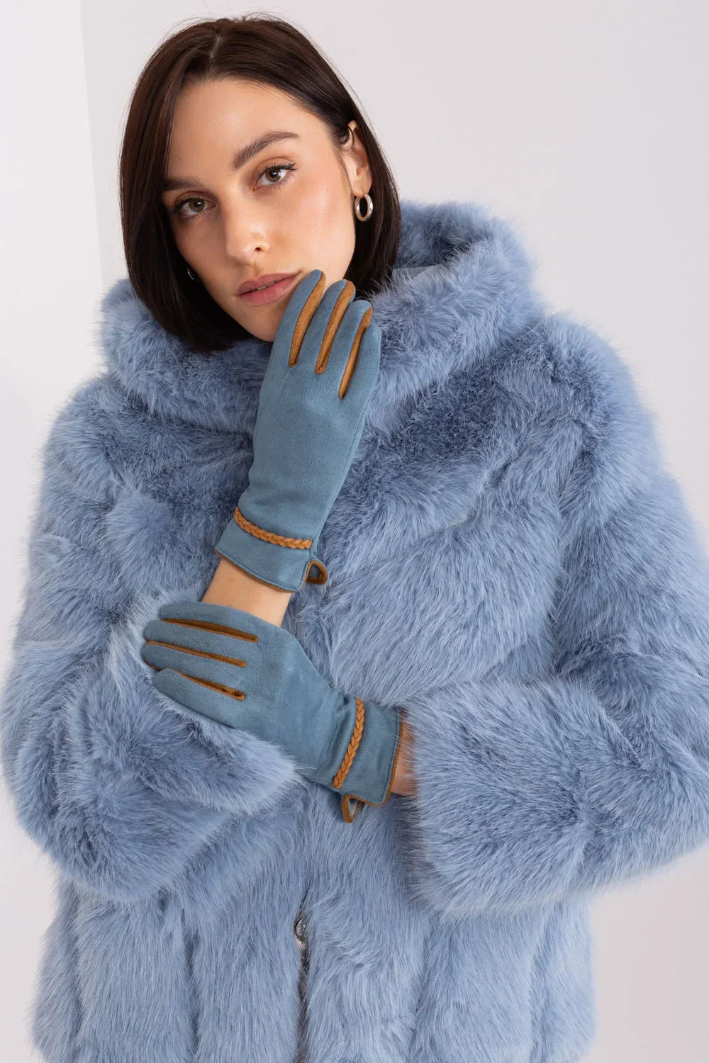 Elegantní dámské rukavice z hladké tkaniny s kontrastními vsadkami mezi prsty. Ozdobné kontrastní pletené pásky na zápěstí. Palec a ukazováček s vyšívanou květinou, která umožňuje ovládat telefon bez nutnosti sundávat rukavice.