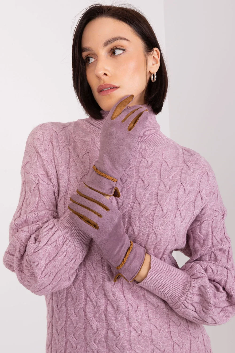 Elegantní dámské rukavice z hladké tkaniny s kontrastními vsadkami mezi prsty. Ozdobné kontrastní pletené pásky na zápěstí. Palec a ukazováček s vyšívanou květinou, která umožňuje ovládat telefon bez nutnosti sundávat rukavice.