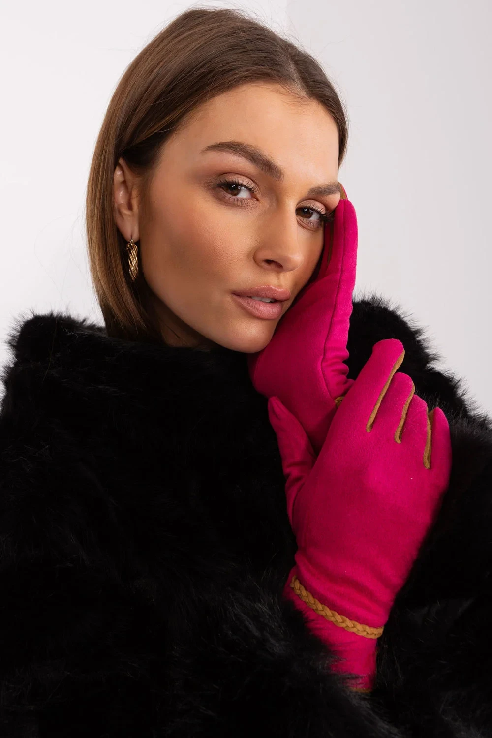 Elegantní dámské rukavice z hladké tkaniny s kontrastními vsadkami mezi prsty. Ozdobné kontrastní pletené pásky na zápěstí. Palec a ukazováček s vyšívanou květinou, která umožňuje ovládat telefon bez nutnosti sundávat rukavice.