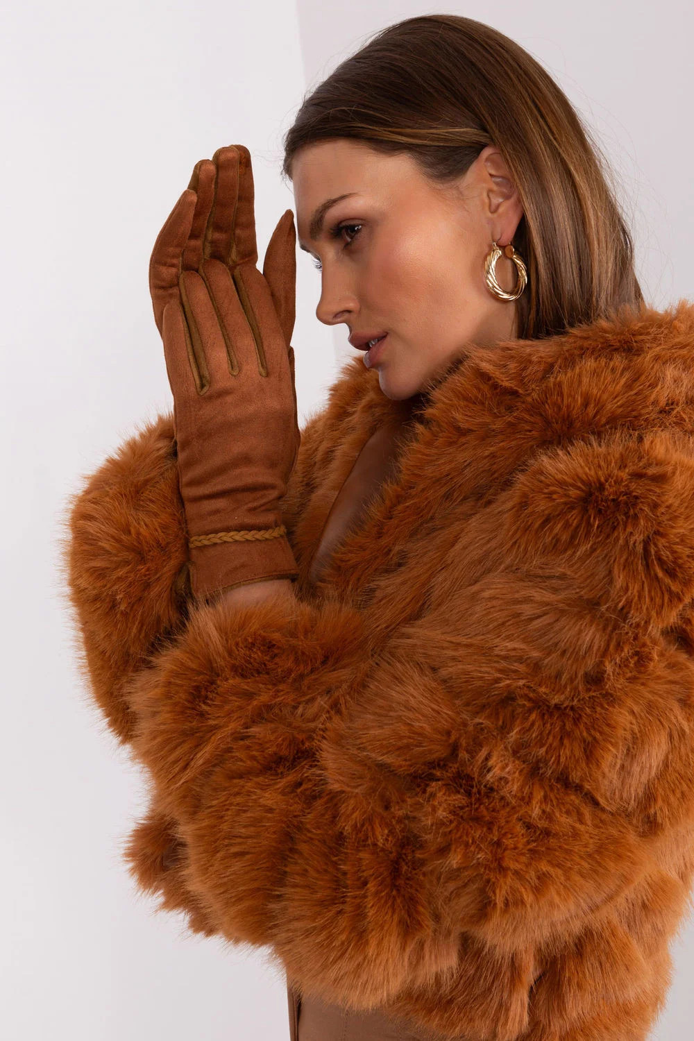 Elegantní dámské rukavice z hladké tkaniny s kontrastními vsadkami mezi prsty. Ozdobné kontrastní pletené pásky na zápěstí. Palec a ukazováček s vyšívanou květinou, která umožňuje ovládat telefon bez nutnosti sundávat rukavice.