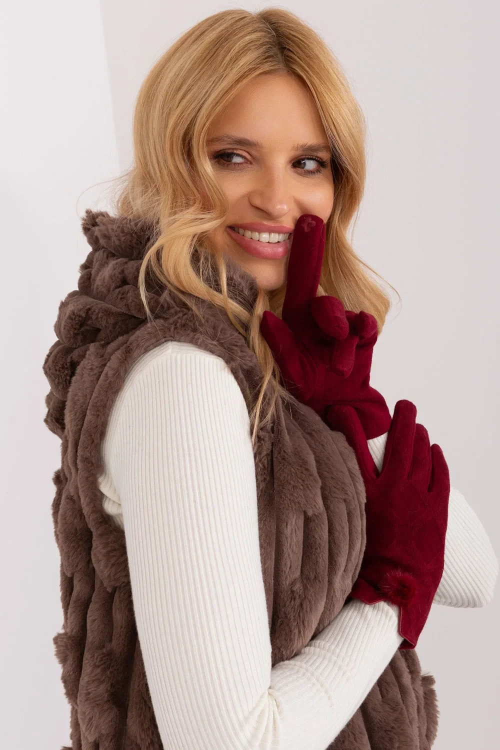 Elegantní dámské rukavice ze zateplené tkaniny s ozdobným geometrickým vzorem. Ozdobné bambulky na zápěstí. Ukazováček s vyšívanou květinou, který umožňuje ovládat telefon bez nutnosti sundávat rukavice.