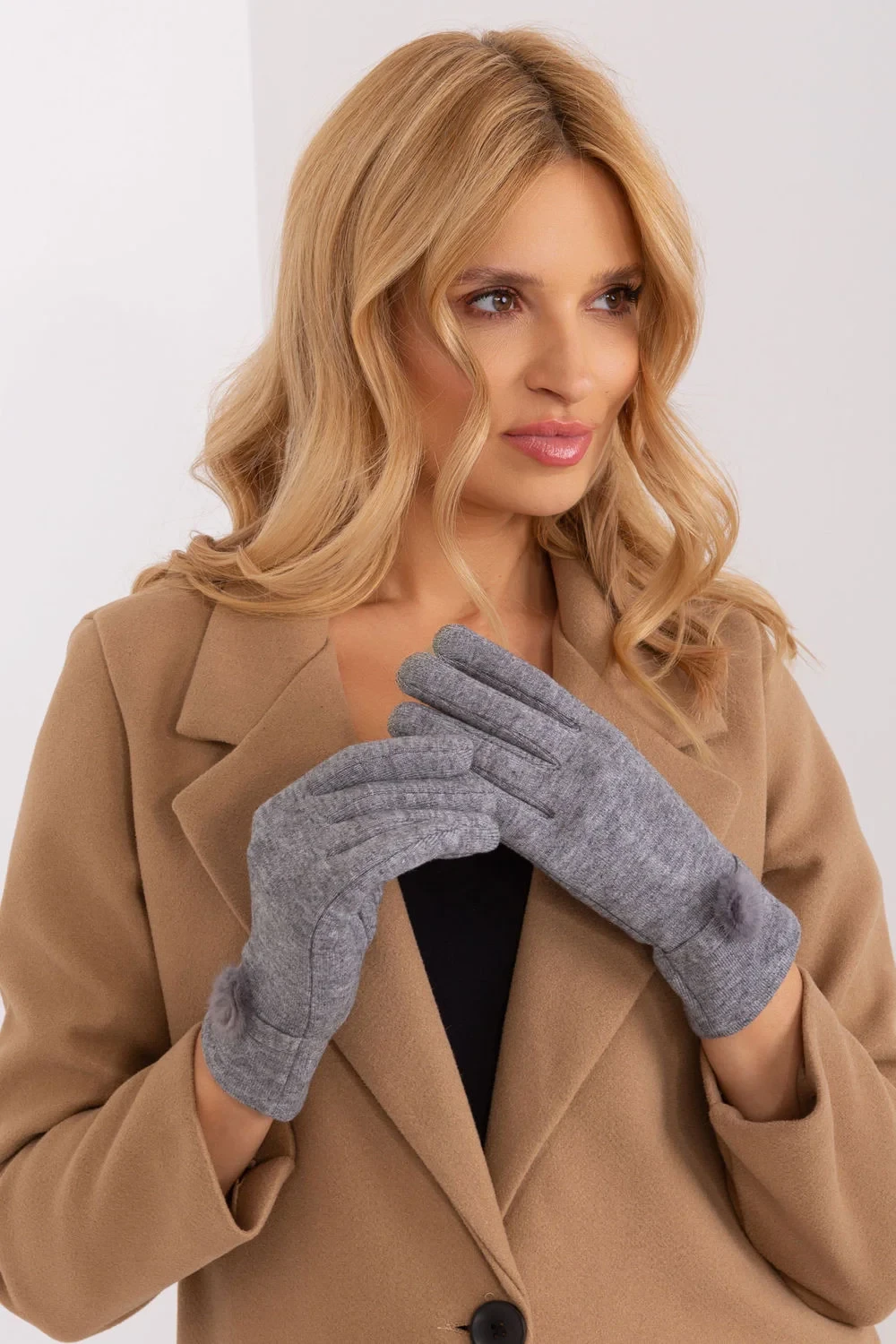 Elegantní pletené dámské rukavice z hladké tkaniny. Ozdobné bambulky na zápěstí. Ukazováček s vyšívanou květinou, která umožňuje ovládat telefon, aniž byste si museli rukavice sundávat.