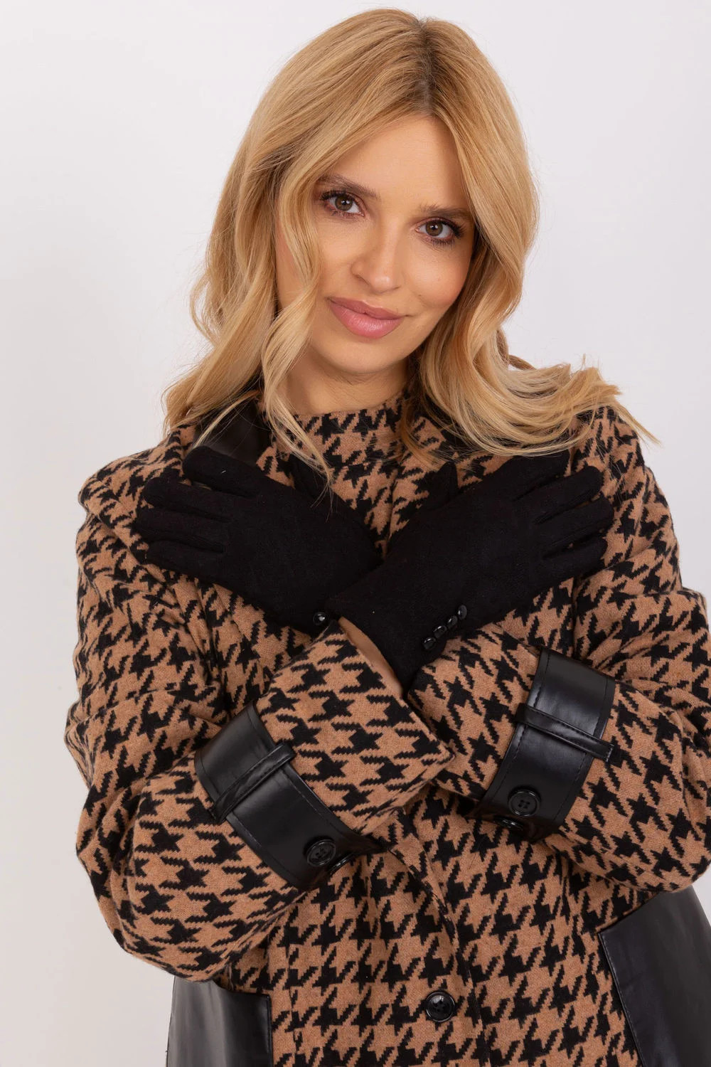 Elegantní dámské rukavice z látky s ozdobným geometrickým vzorem. Ozdobné knoflíky s povrchovou úpravou na zápěstí. Ukazováček s vyšívanou květinou, který umožňuje ovládat telefon bez sundávání rukavic.