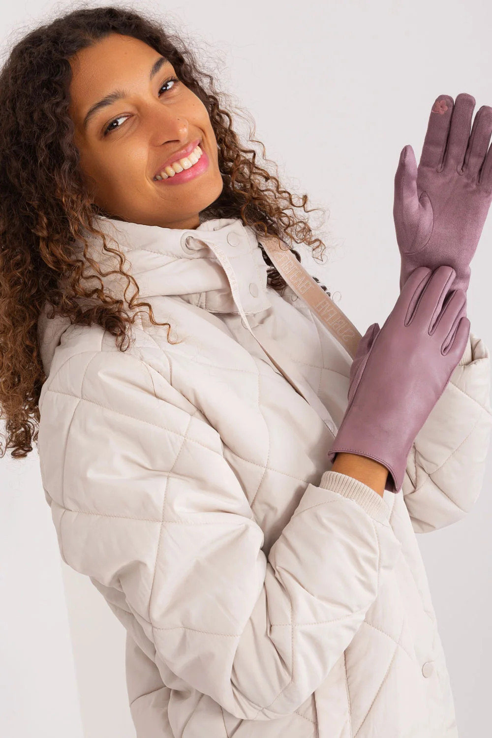 Elegantní dámské rukavice vyrobené z kombinace dvou různých materiálů. Ukazováček s vyšívanou květinou umožňuje ovládat telefon, aniž byste si museli rukavice sundávat.