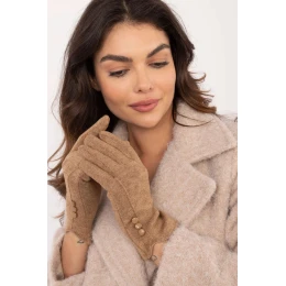 Elegantní dámské rukavice z teplého hladkého materiálu. Na zápěstí ozdobné knoflíčky. Ukazovák s vyšívaným kvítkem umožňující obsluhu telefonu bez nutnosti sundávat rukavice.
