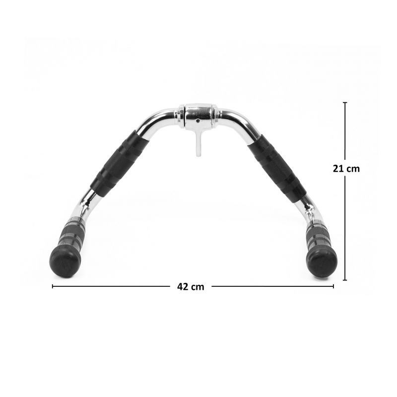 Tvar rukojetí umožňuje širší rozsah pohybu než při rovném nebo úzkém úchopu. Umožňuje silnější svalové napětí, což vede k efektivnějšímu tréninku. Jeho konstrukce zaručuje dokonalé umístění rukou a vynucuje si správný pohyb. Široký rozestup rukojetí umožňuje provádět cvik pod jiným úhlem než při úzkém úchopu. To dává možnost efektivního tréninku a plného rozvoje svalové skupiny. Je vyroben z oceli a je možné s ním cvičit se značnou zátěží.