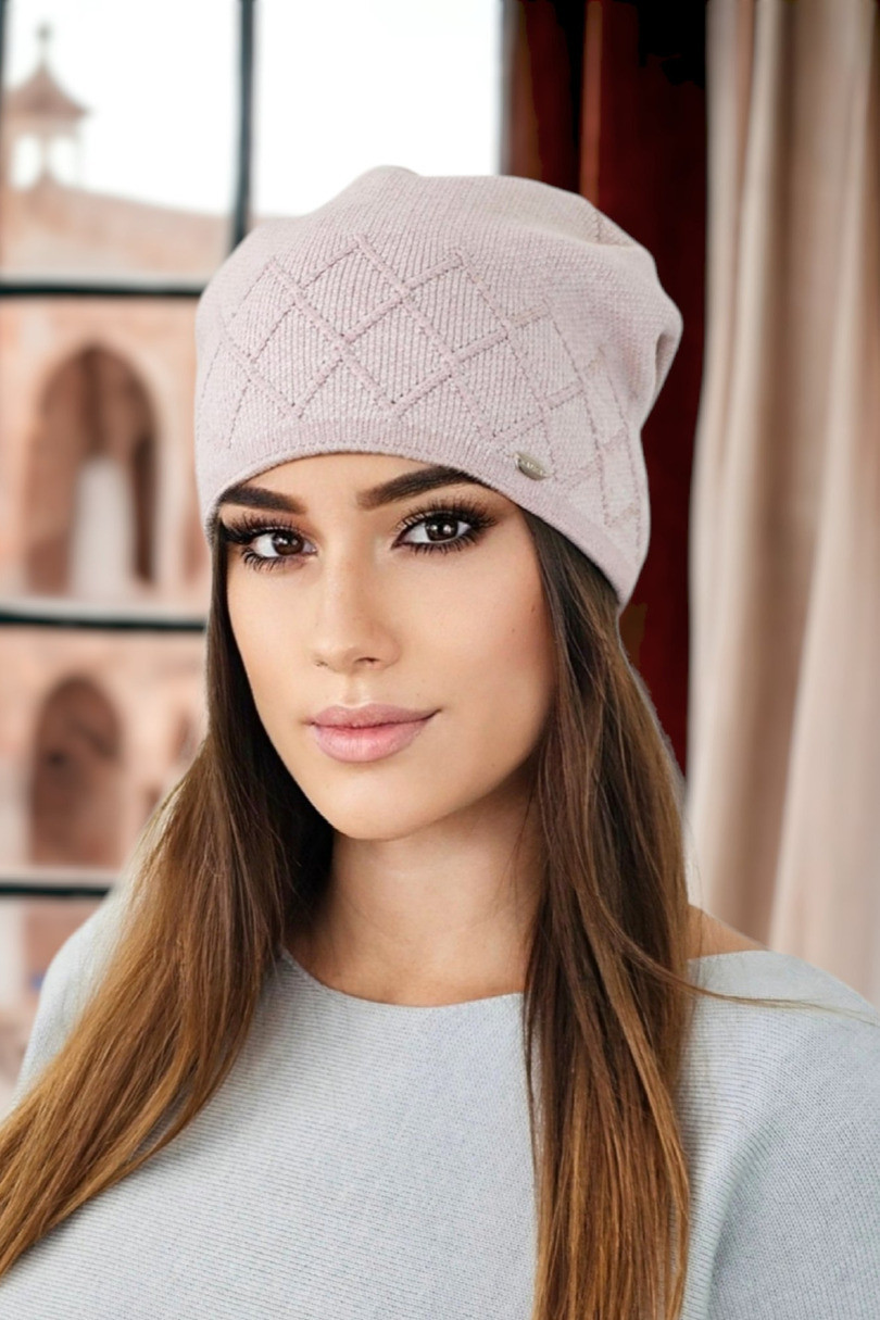A classic women's cap in peplite, additionally decorated with a geometric pattern. Thanks to the high content of viscose in the composition of the yarn, the product is exceptionally pleasant to the touch, without biting.Ideally suitable for allergyów. Available in several colour variants.