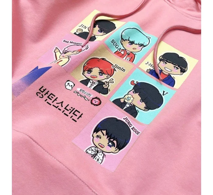 Mikina má volný střih, délku k bokům a obléká se přes hlavu. Rukávy a spodní okraj modelu jsou olemované stahovacími lemy. Model má jednu "klokaní" kapsu.