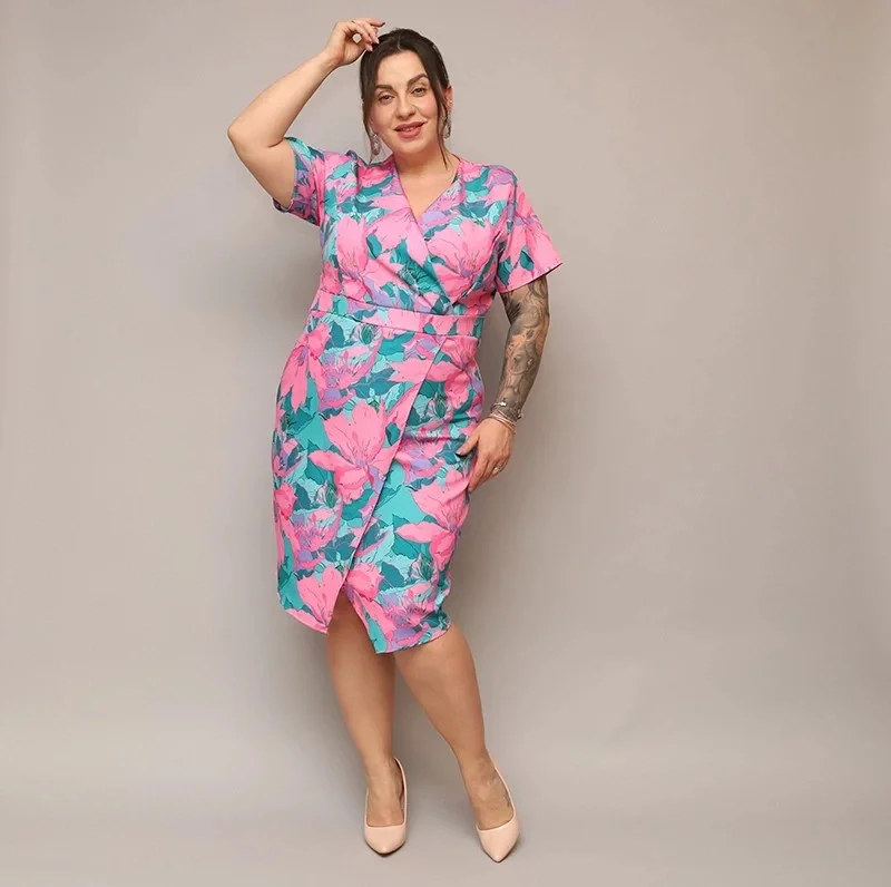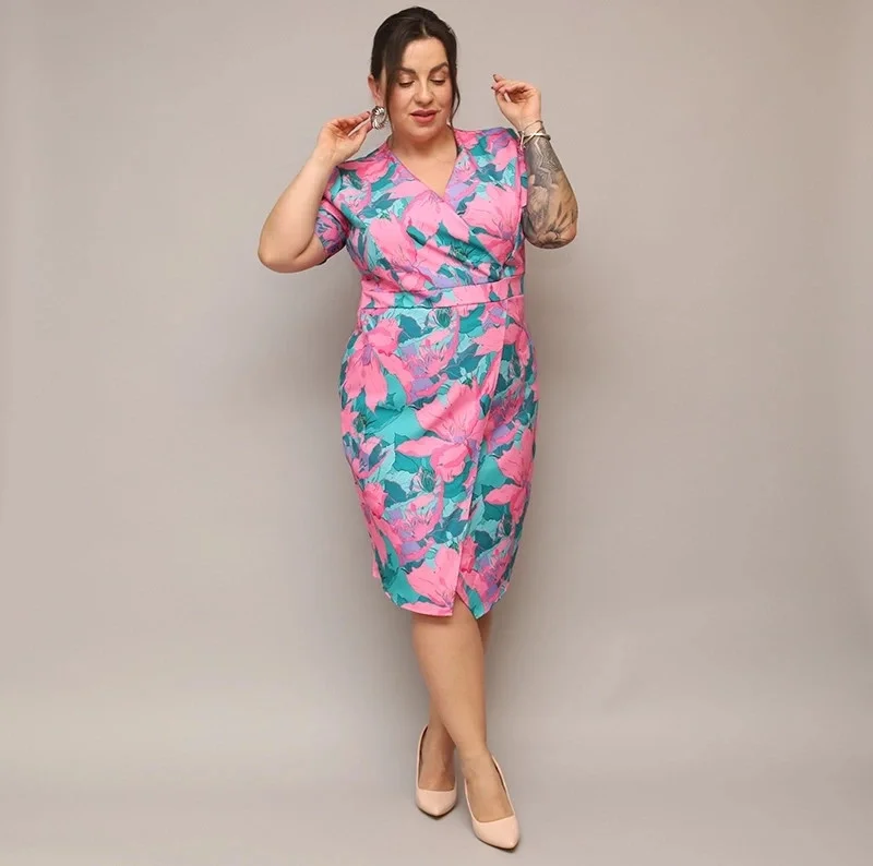 Růžovo-zelené dámské přeložené obálkové květované šaty v délce ke kolenům (742)