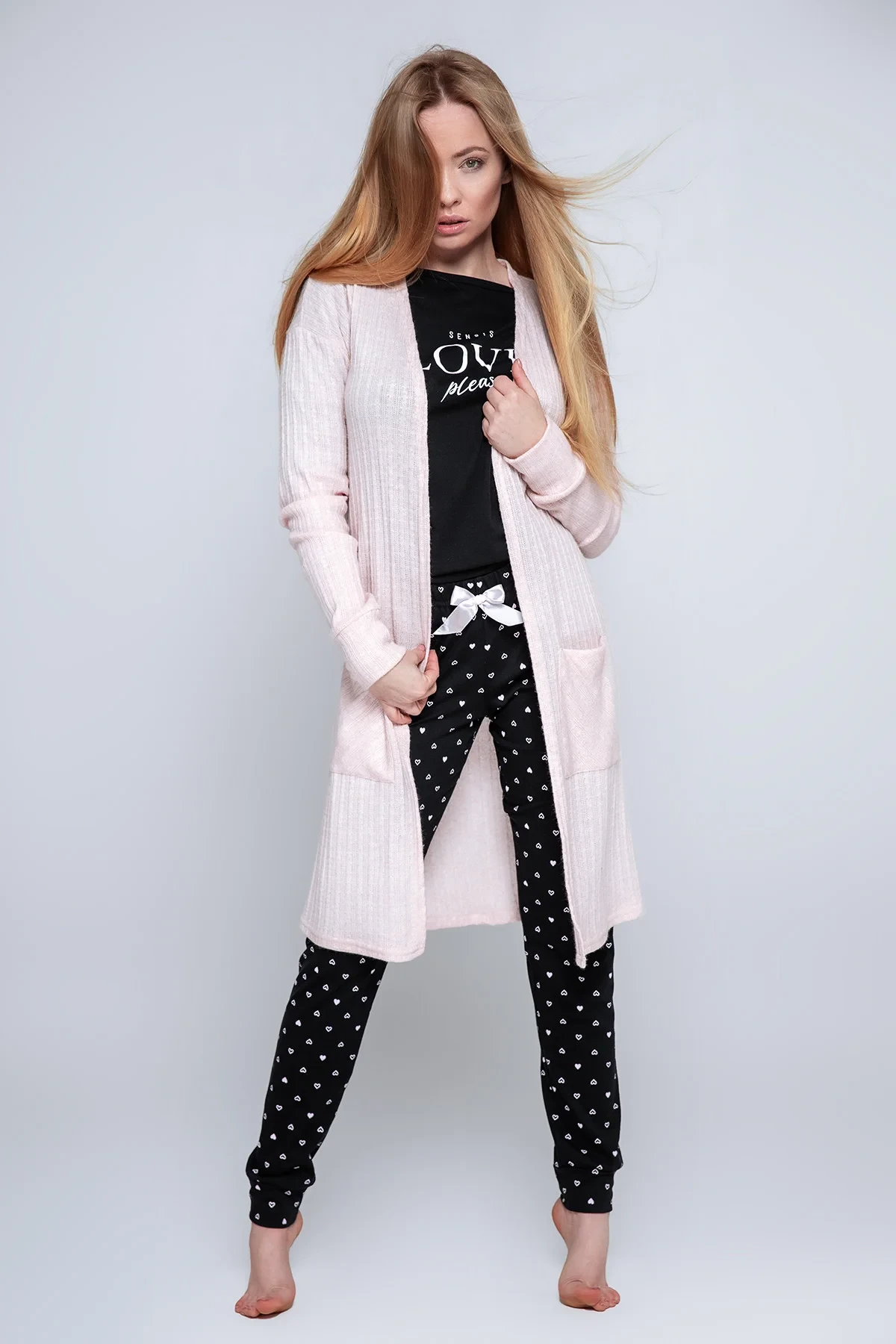 Hřejivý dlouhý svetr z měkkého úpletu volného, pohodlného střihu, který lze použít i jako svetr, bez zavazování v pase, s dlouhými rukávy, dvěma kapsami na bocích a příjemnými, velmi ženskými barvami. 52 % viskóza, 26 % polyester, 22 % polyamid.