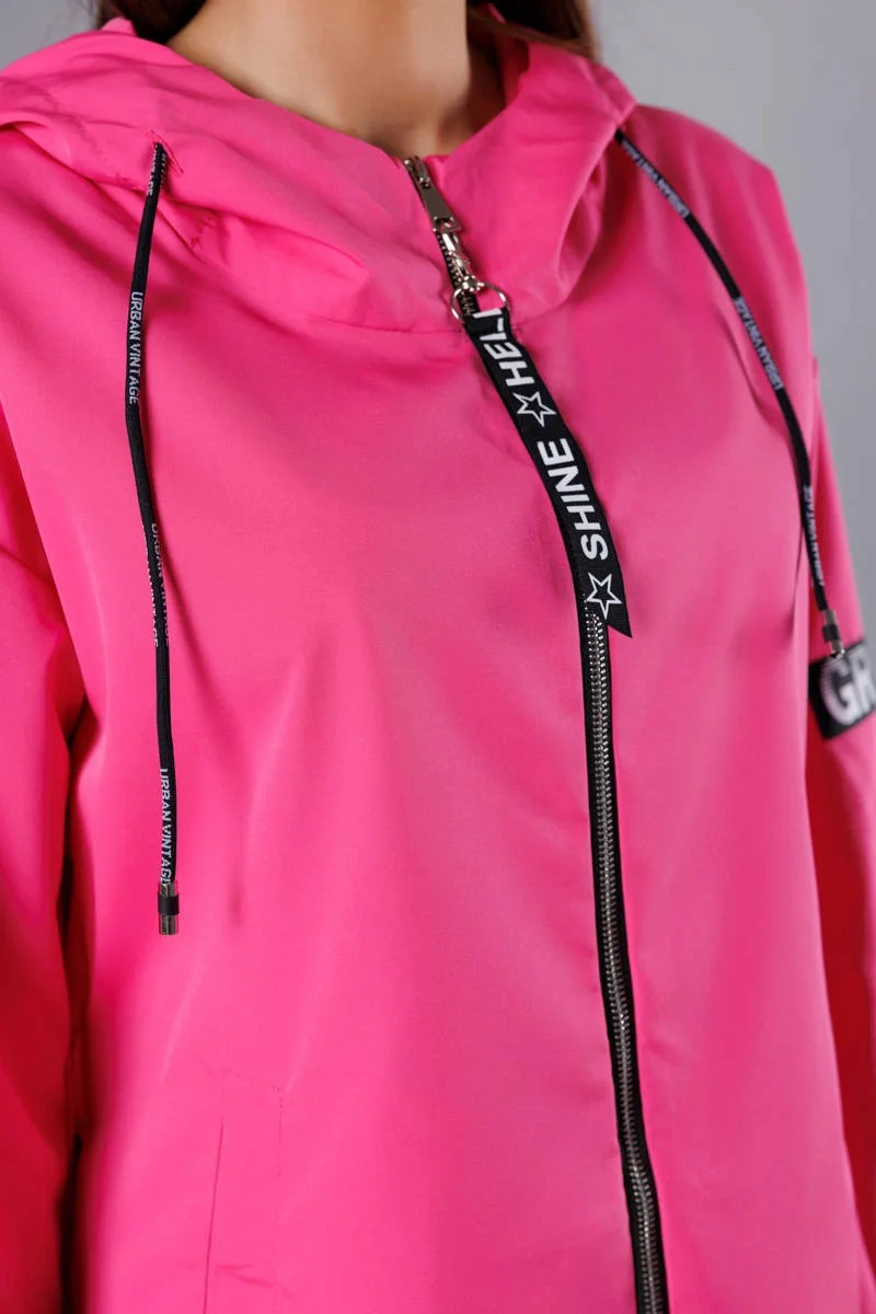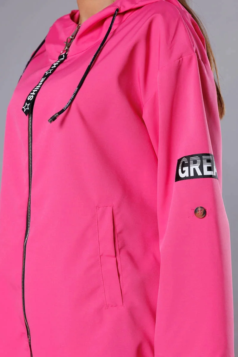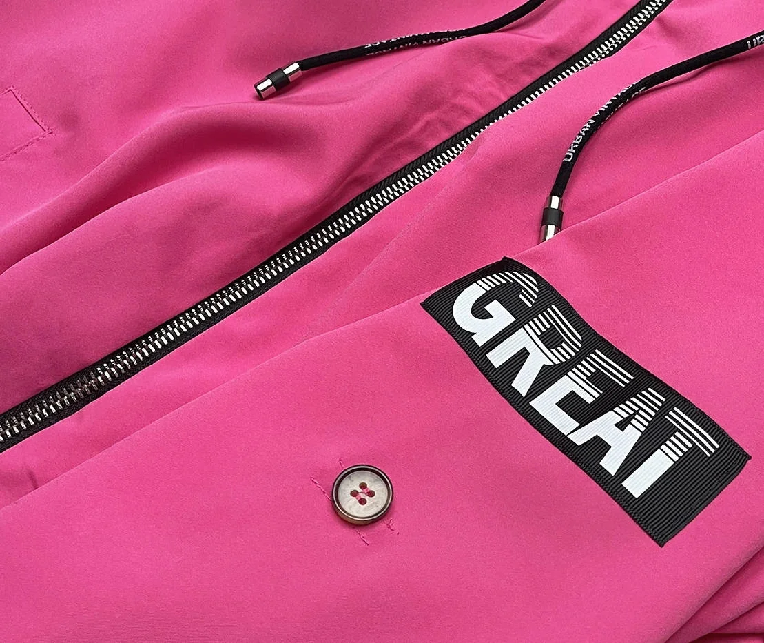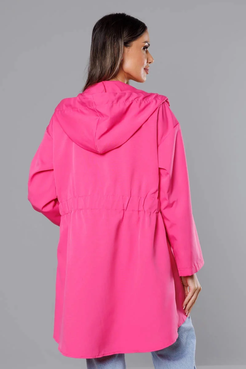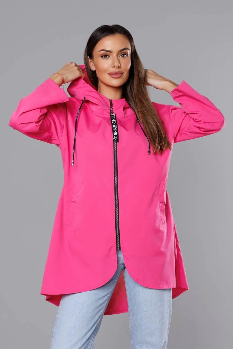 Přehoz se zapíná zipem a má dvě kapsy bez zapínání. Vzadu je v pase guma. Rukávy je možné ohrnout. Přední část modelu má délku k bokům a zadní část má délku do poloviny stehen.
