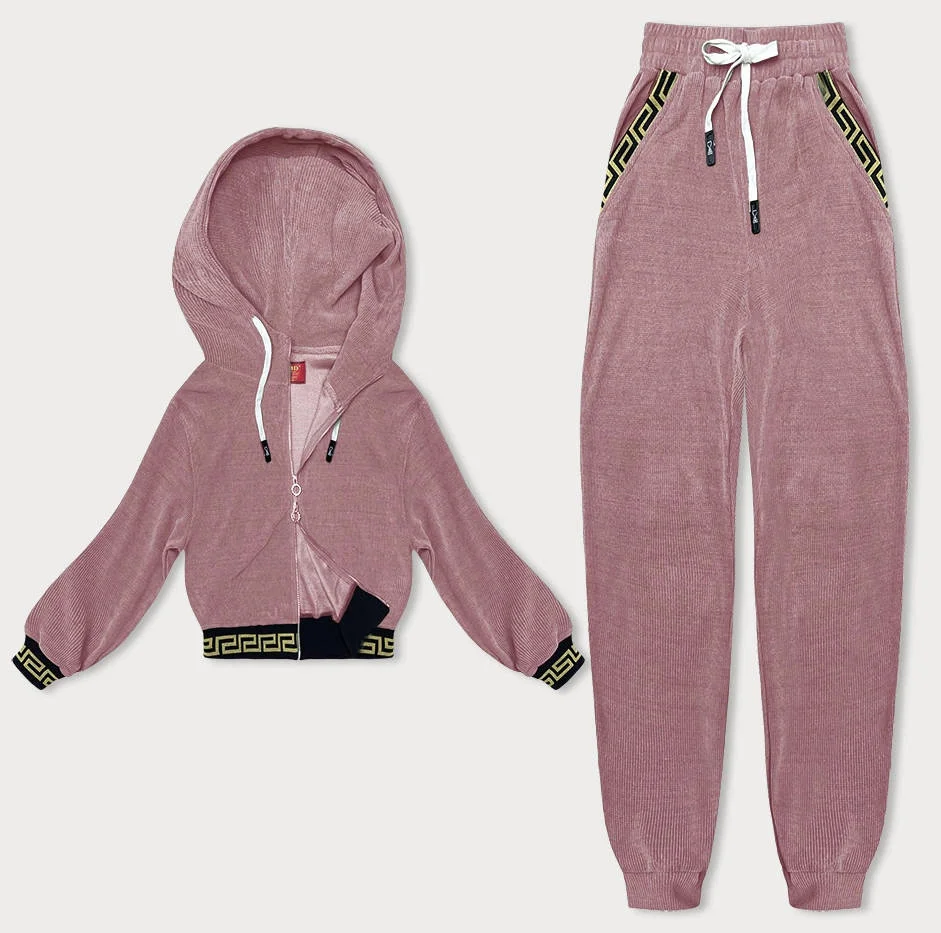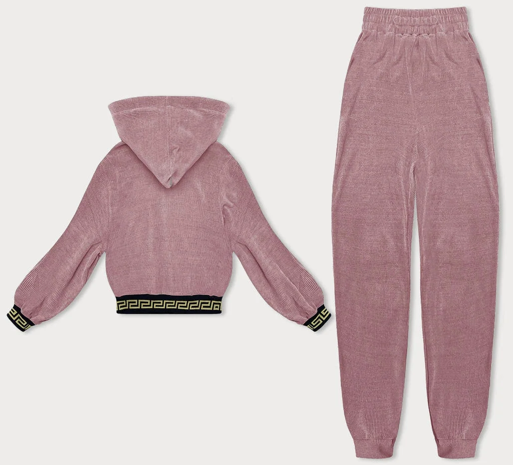 Růžový teplákový žebrovaný komplet s ozdobnými stahovacími lemy (AMG-345A)