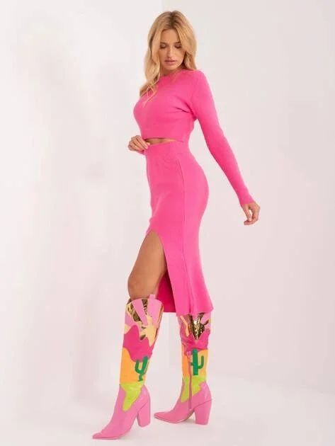 Růžový úpletový dámský komplet - krátká halenka a tužková sukně (14136)