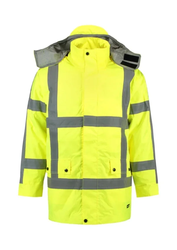 oděv s vysokou viditelností voděodolný, větruodolný a prodyšný materiál retroreflexní pruhy odnímatelná kapuce větrací otvory v podpaží vnitřní náprsní kapsy obousměrný zip s otevřeným koncem voděodolné zipy podlepené švy odnímatelná hřejivá podšívka certifikace dle norem EN ISO 20471/A1 (třída 3), EN 343 (třída 3:1) Tricorp číslo produktu: 403005