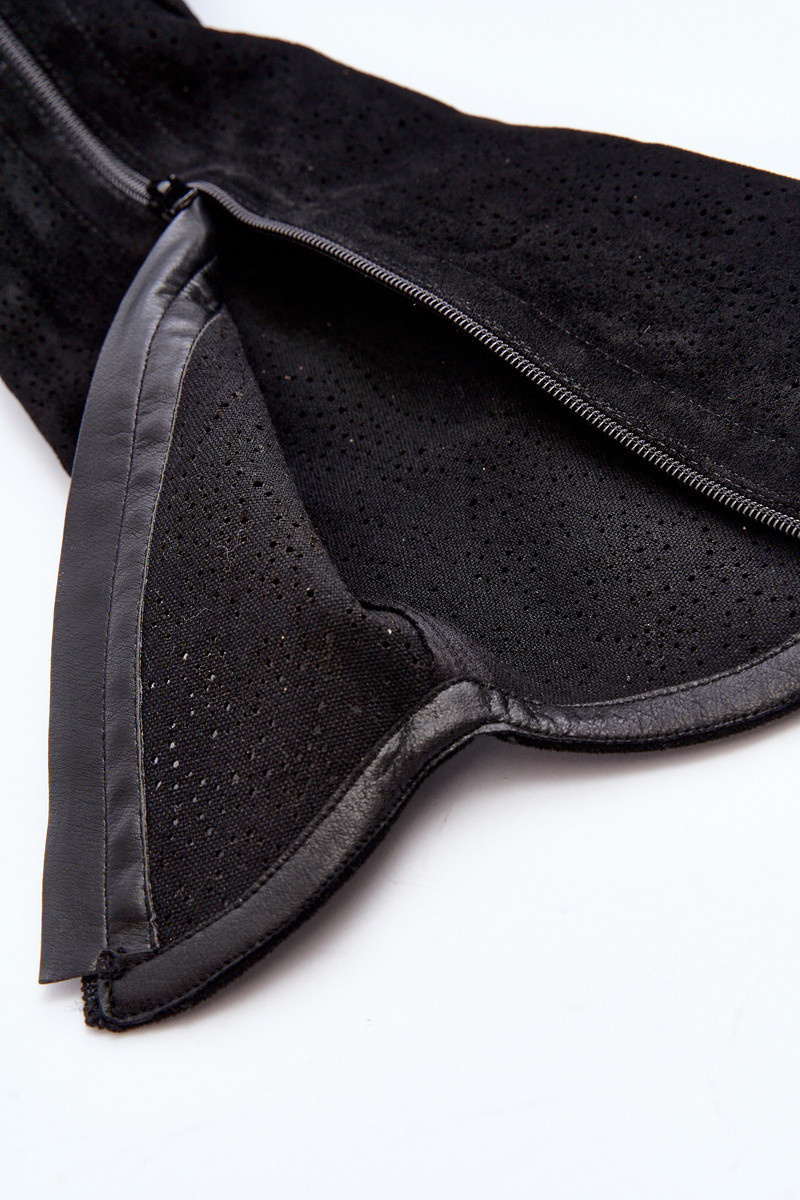 Průsvitné dámské kozačky skvěle doplní téměř každý denní outfit! Vyrobeno z ekologického semiše. Umístěné na plochém, stabilním podpatku. Zakulacené špičky. Schaft přes koleno, zapíná se na zip. Navíc má tento model zpevněnou patu. Určitě by sis je měla pořídit! Při výběru velikosti se řiďte tabulkou velikostí.