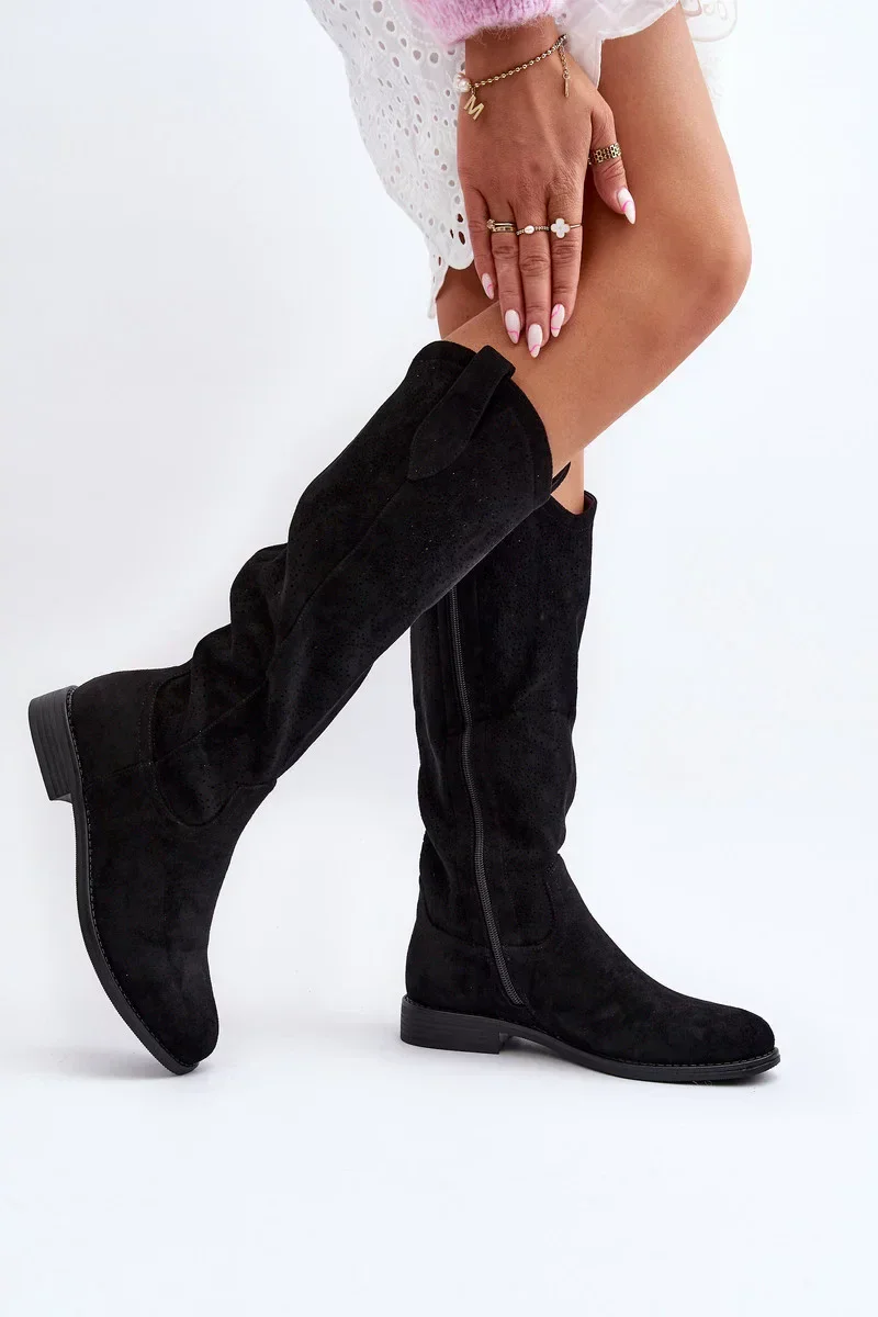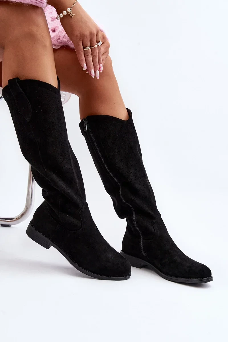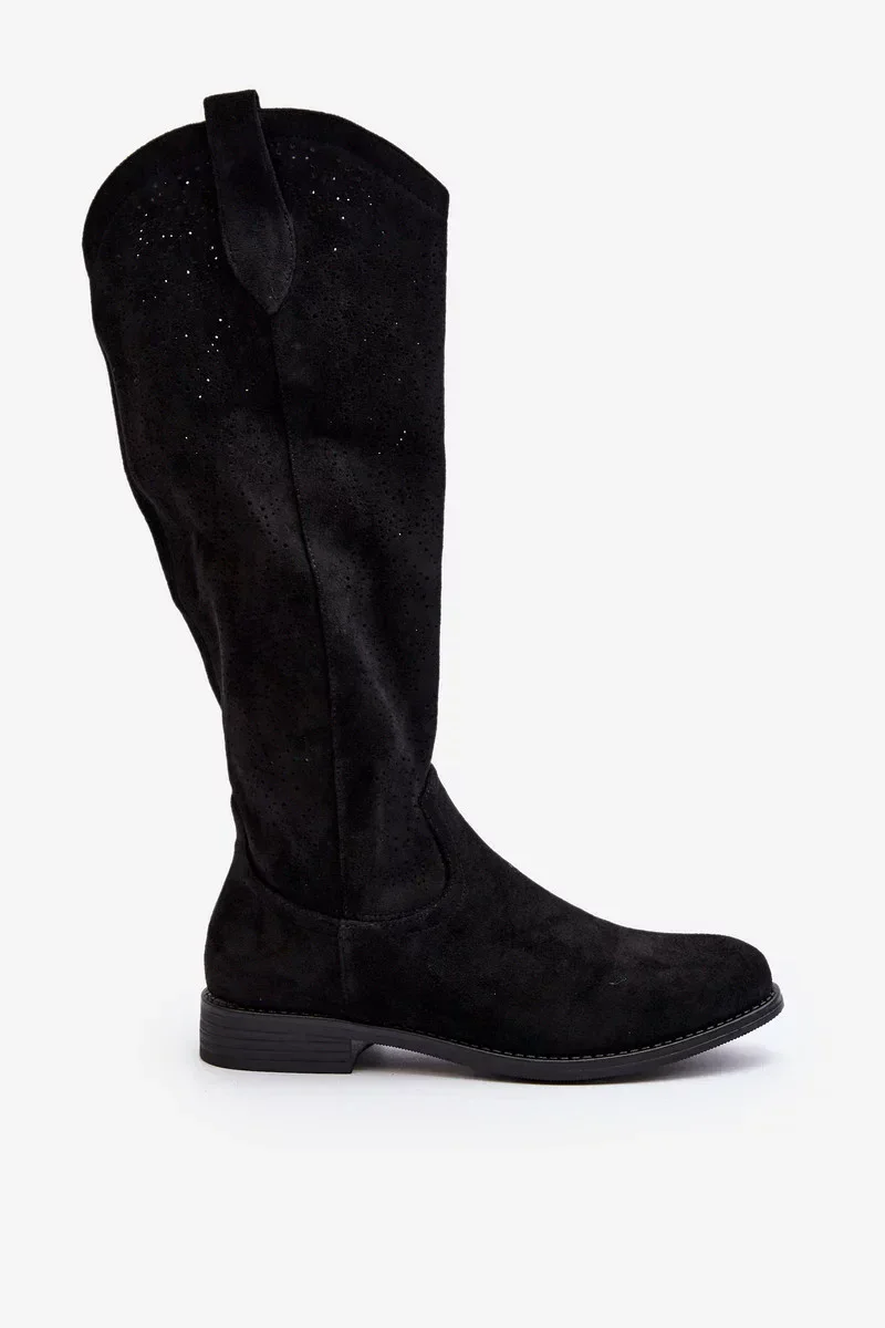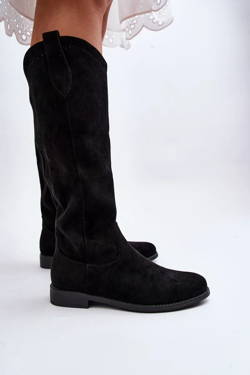 Dámské prolamované kozačky skvěle doplní téměř každý každodenní styling! Vyrobeno z ekologického semiše. Nasazené na plochém stabilním podpatku. Zaoblené prsty. Svršek nad kolena, zapínání na zip. Tento model má navíc vyztuženou patu. Rozhodně byste je měli mít!Při výběru velikosti se řiďte tabulkou velikostí.