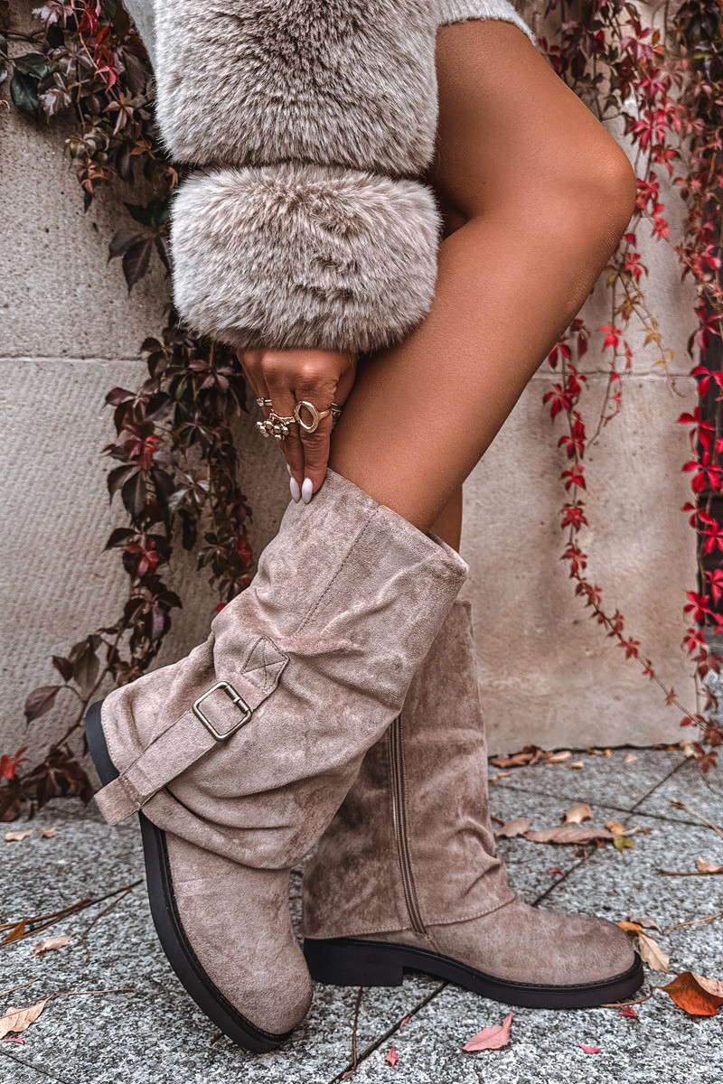 Dámské kozačky vyrobené z ekologické semišové kůže jsou ideální volbou pro ženy, které ocení styl a pohodlí zároveň. Model na ploché podrážce zajišťuje komfort při každodenním nošení a zároveň vypadá elegantně a žensky. Zapínání na zip usnadňuje obouvání a sundávání, čímž zvyšuje praktičnost. Poutavý, zahnutý límec zdobený páskem s přezkou dodává celku módní charakter. Měkká textura eko semiše zvýrazňuje vzhled bot, což je činí skvělým doplňkem podzimně-zimních outfitů. Tyto kozačky skvěle poslouží jak s sukněmi a šaty, tak s přiléhavými kalhotami, a vytvářejí stylový každodenní vzhled. Při výběru velikosti se prosím řiďte tabulkou velikostí. Při výběru velikosti se řiďte tabulkou velikostí.
