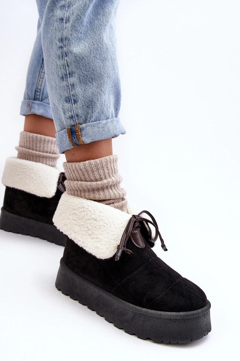 Dámské sněžné boty se skvěle osvědčí během mrazivých dnů. Vyrobeno z eko semiše. Upevněno na silné platformě. Zateplené kožešinou. Slip-on styl. Horní část je ozdobena tkanicí. Při výběru velikosti se řiďte tabulkou velikostí.