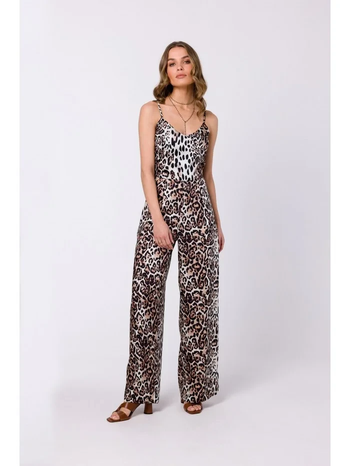 Kalhotový kostým s překládaným výstřihem a na tenkých ramínkách zavazovaných na zádech. Kombinéza s elastickým pasem a kapsami na bocích.
