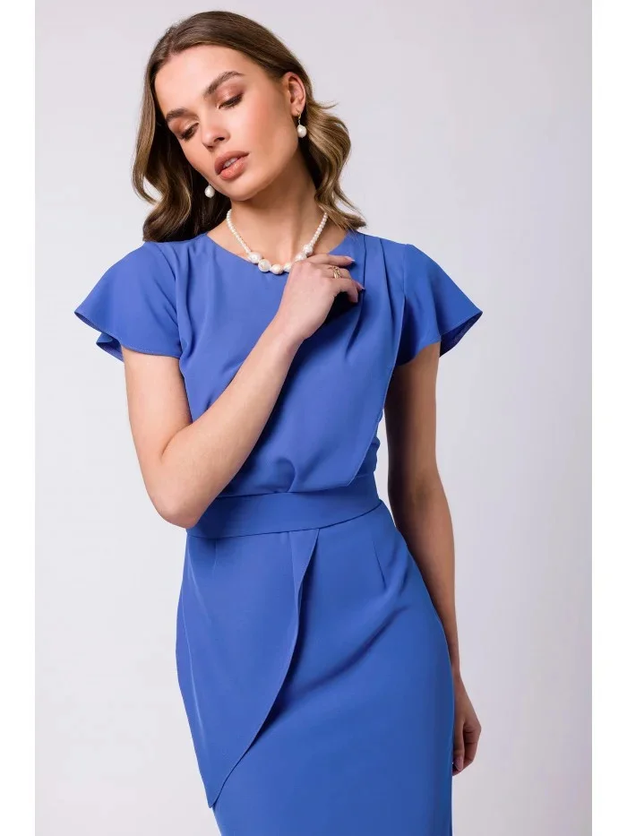 95 % polyester 5 % elastan Originální pouzdrové šaty s další ozdobnou vrstvou látky, v pase stažené páskem na knoflík. PODROBNOSTI O PRODUKTU: pouzdrové šaty z tkané látky s asymetrickou dvojitou vrstvou v přední části krátké rukávy délka ke kolenům nepodšité zapínání na knoflíky pásek je přiložen naše modelka je vysoká 174 cm a nosí velikost S