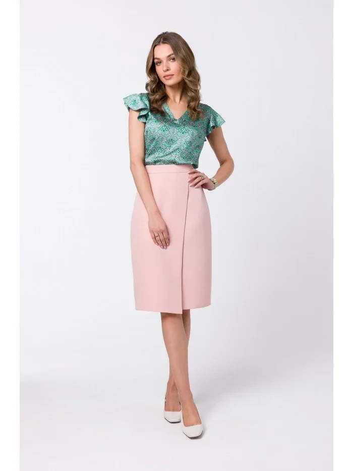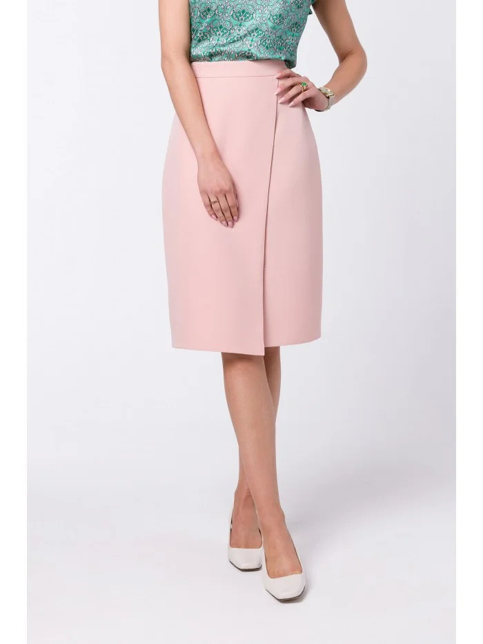 S343 Sukně áčkového střihu se zavinovacími detaily - pudrová