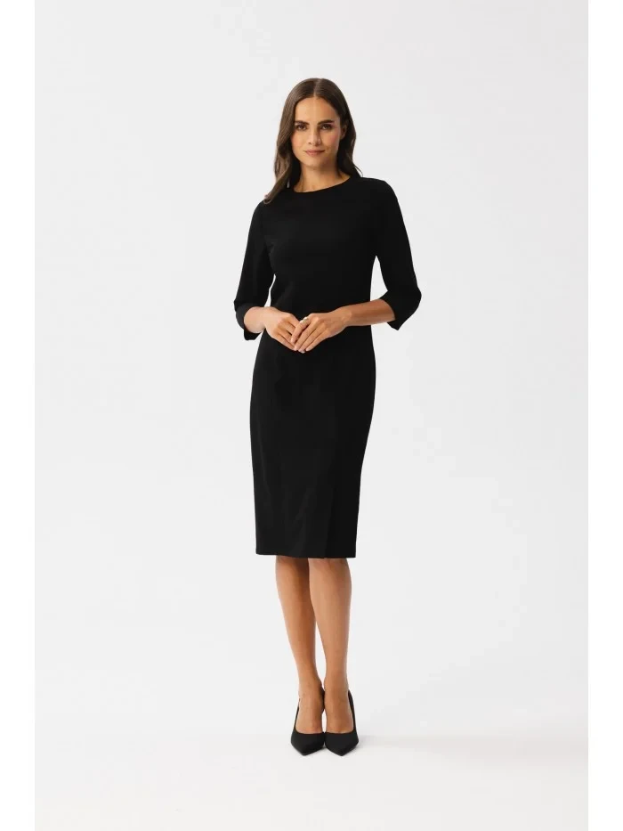 65% polyester 30% wiskoza 5% elastan PODROBNOSTI O PRODUKTU: tužkové šaty z tkané látky s výstřihem 3/4 rukávy délka pod kolena s předním rozparkem skrytý zadní zip bez podšívky naše modelka měří 174 cm a nosí velikost S navrženo a vyrobeno v Polsku